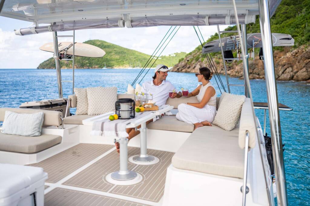 Luxus-Crew-Katamaran OCEANA, Baujahr 2021, liegt vor Anker in Caribbean Leewards, Caribbean Virgin Islands (BVI). Sie verfügt über 4 Kabinen und bietet Platz für 8 Personen.