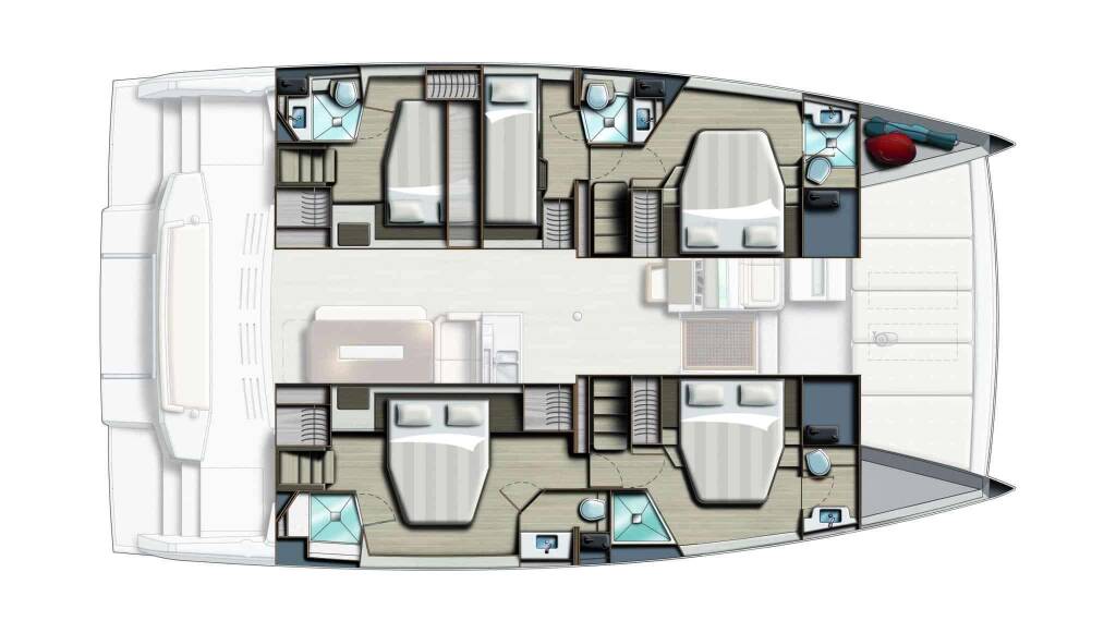 Accommodation: 4 queen berth guest cabins each with a private en-suite electric head, shower and sink/vanity. Starboard side heads have dry stall showers, port side heads have wet showers.