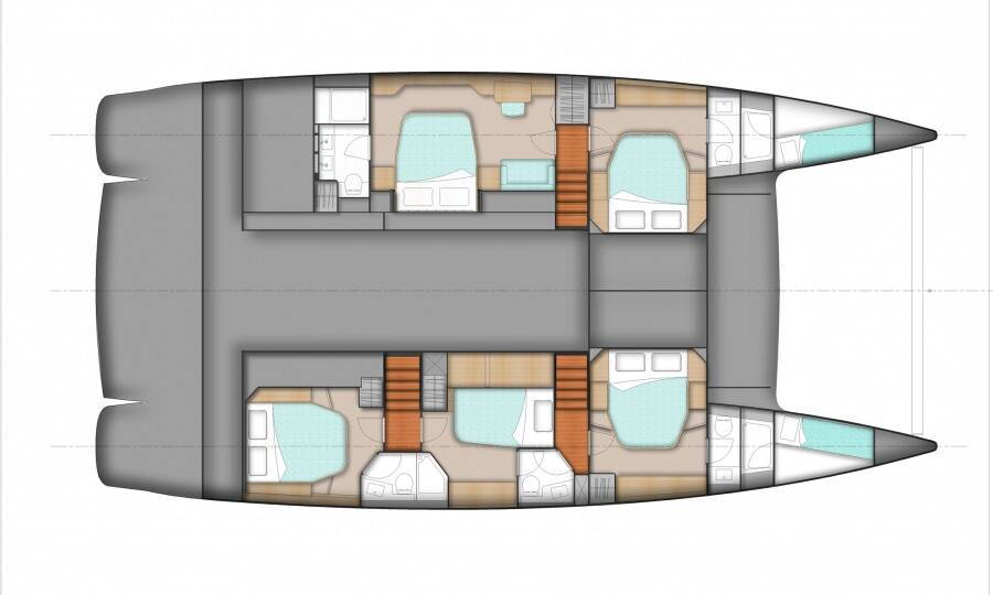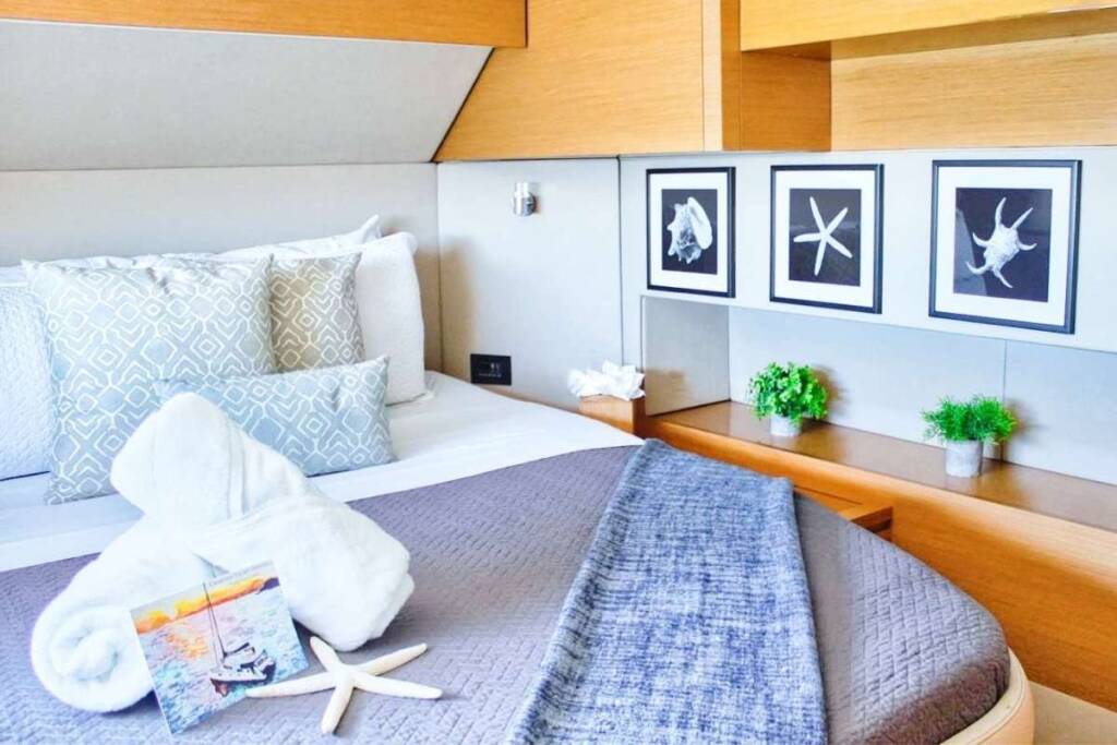 Accommodation: 3 large queen cabins and an enlarged Primary cabin, all with walk around queen size beds, all fully en suite. FULL A/C throughout the yacht.