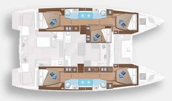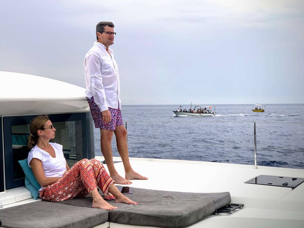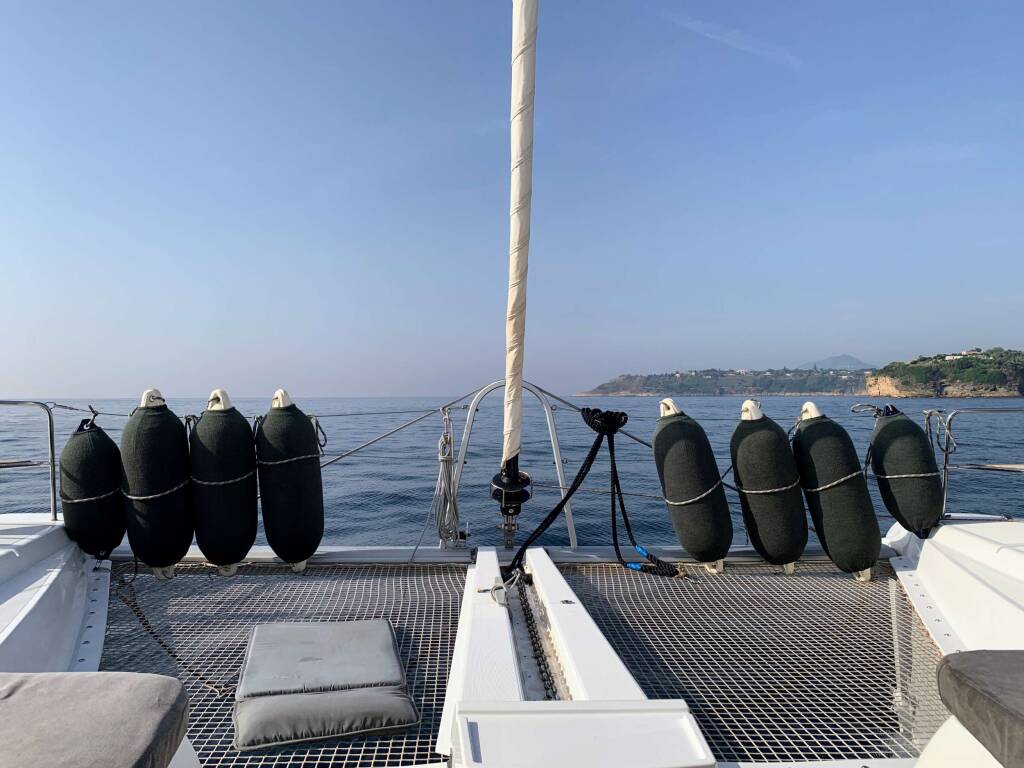 Luxus-Crew-Katamaran OHANA, Baujahr 2019, liegt vor Anker in W. Med -Naples/Sicily. Sie verfügt über 4 Kabinen und bietet Platz für 8 Personen.