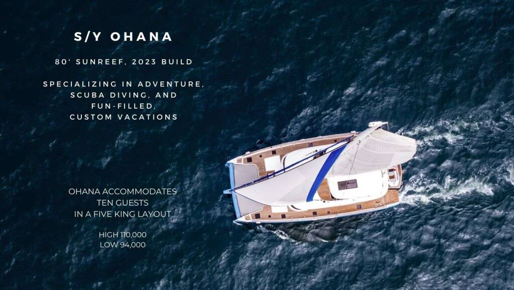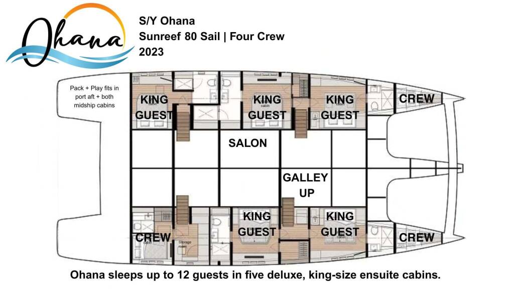 Accommodation: Ohana sleeps up to 12 guests in five deluxe, king-size ensuite cabins. The king beds are all floor-level berths with full-walk around access. Each cabin boasts a mirror-covered wall to allow for maximum light during the day and lend an airy vibe to the comfortable cabins.