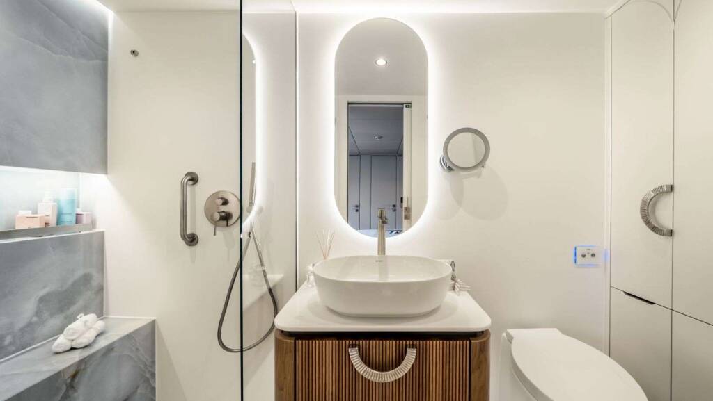 Five spacious heads are ensuite featuring spa-like, waterfall shower heads and full-size commodes. Cabins each have their own temperature control and TVs.