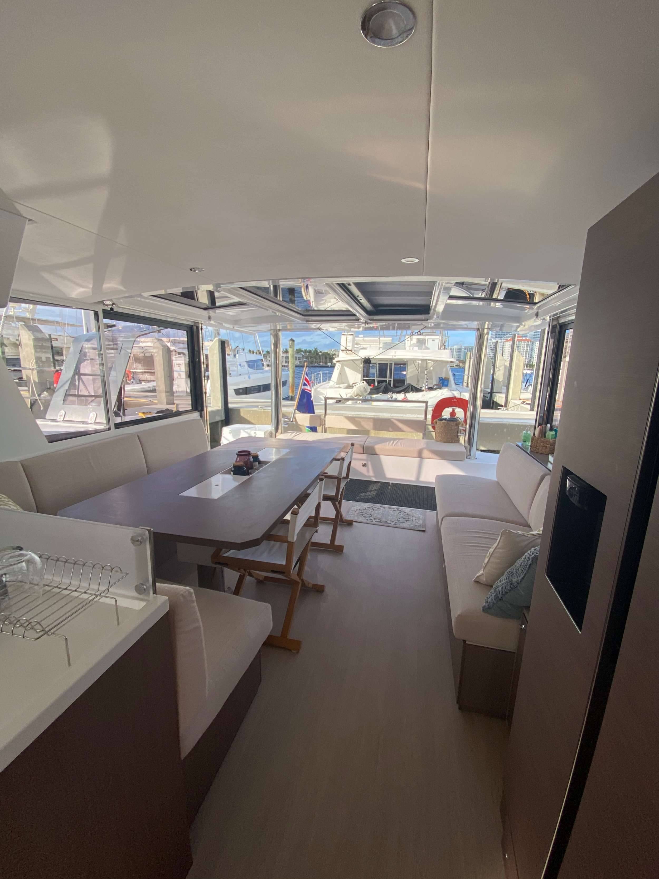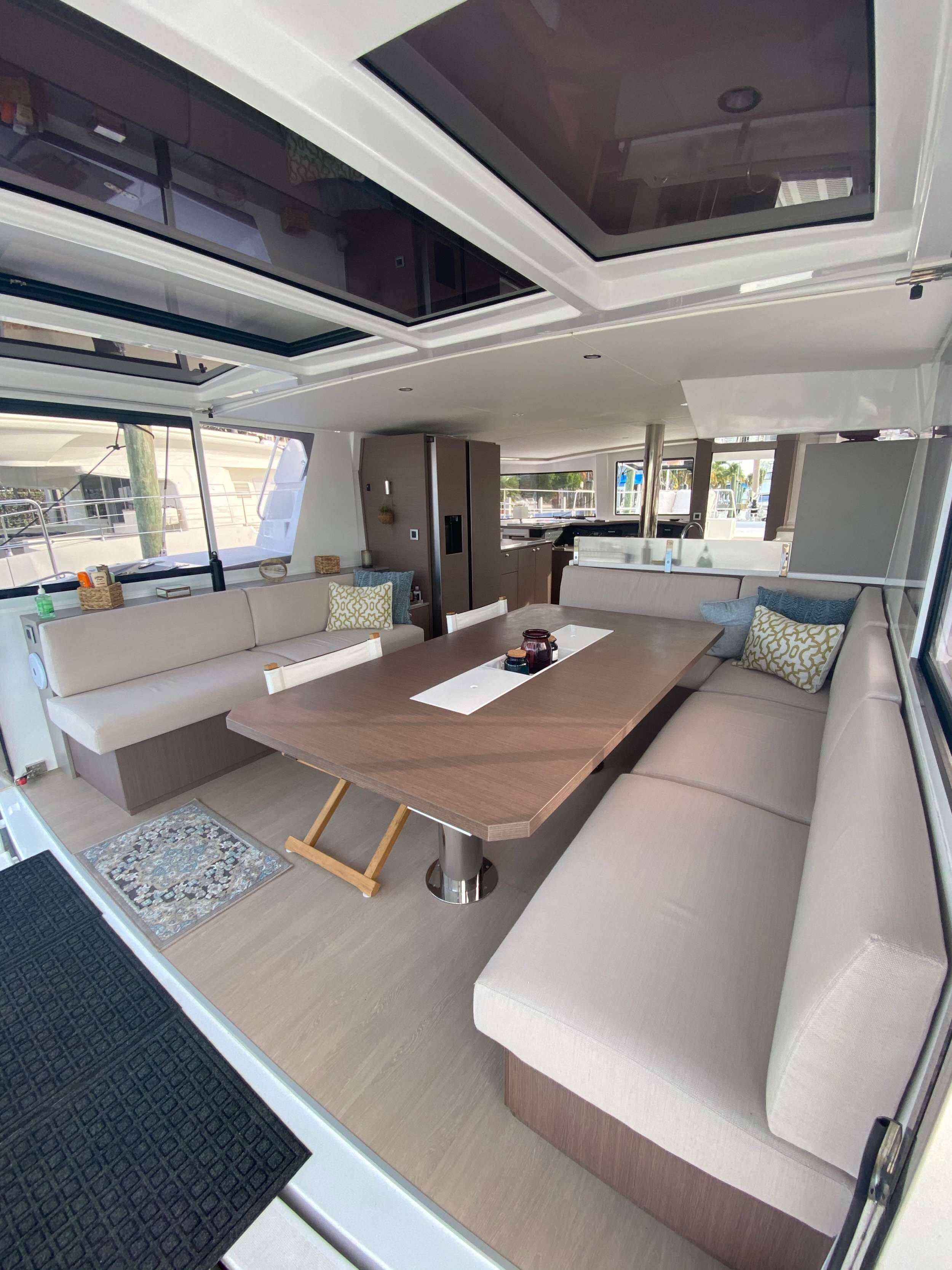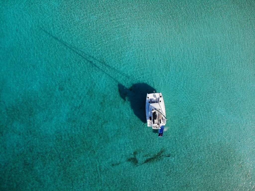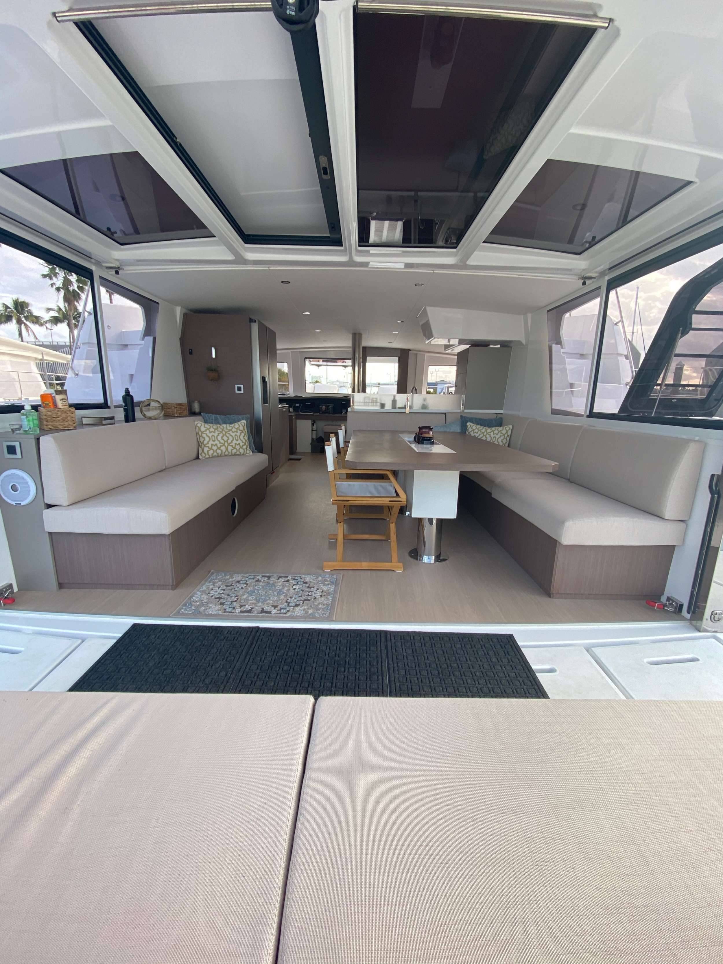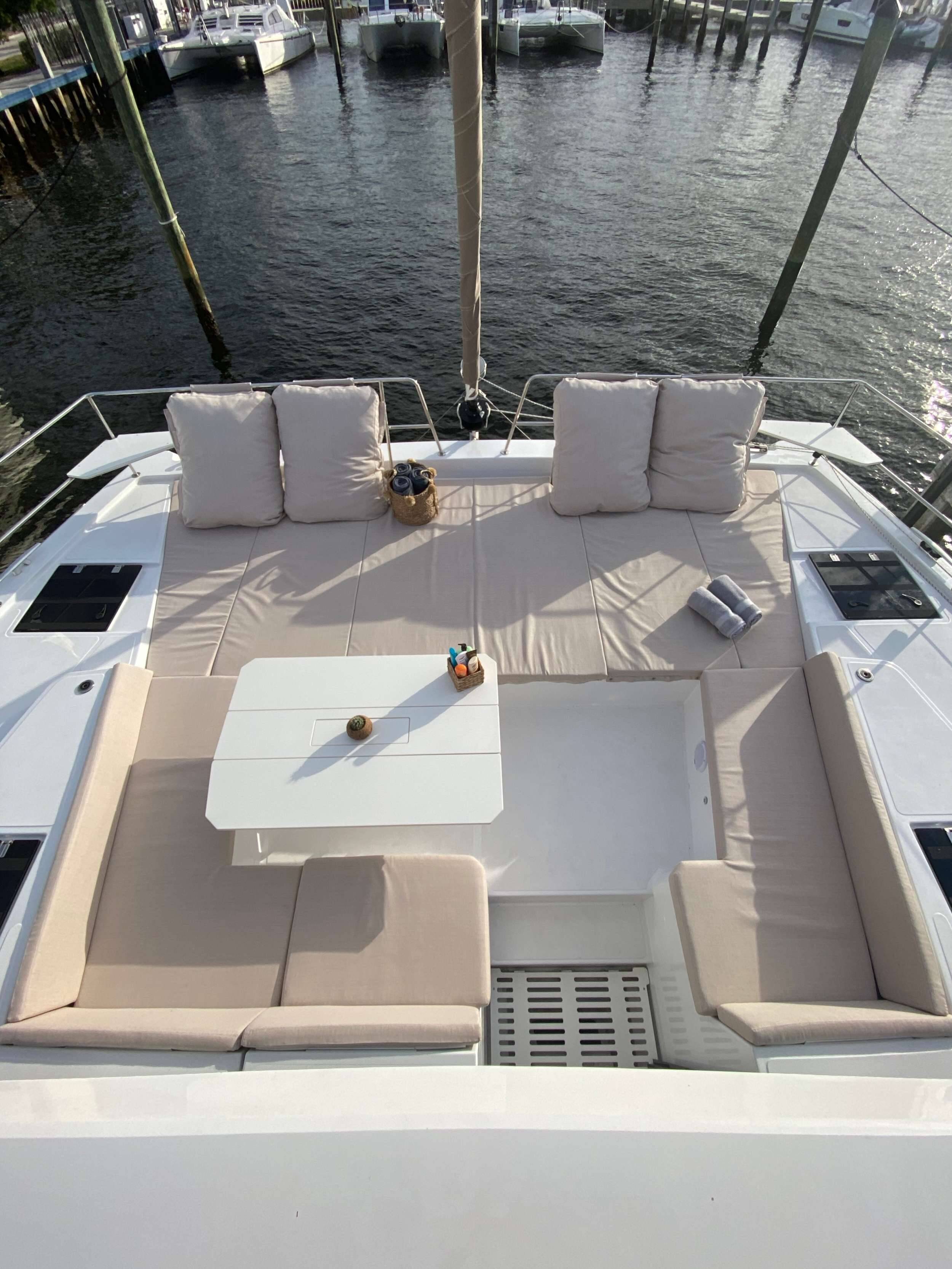 Luxus-Crew-Katamaran OKEANA, Baujahr 2020, liegt vor Anker in Caribbean Virgin Islands (US/BVI), Caribbean Virgin Islands (BVI). Sie verfügt über 4 Kabinen und bietet Platz für 8 Personen.