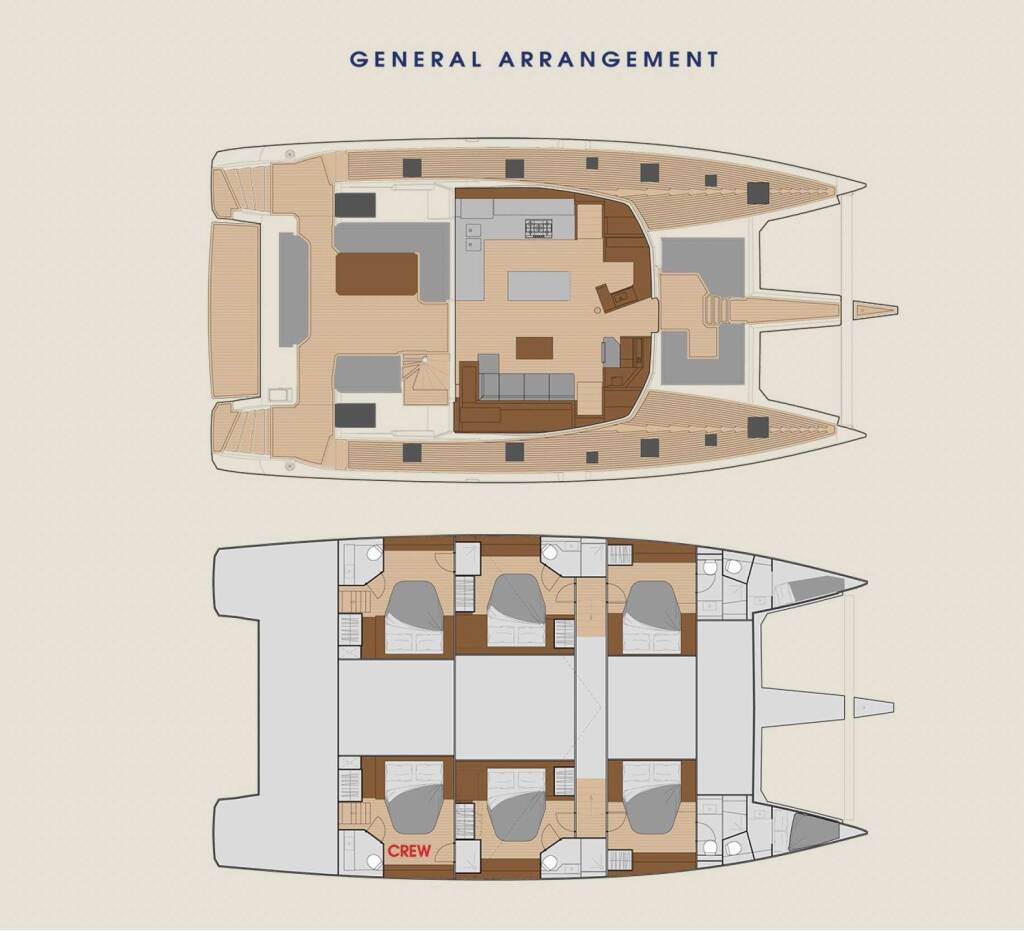 Luxus-Crew-Katamaran OKINAWA, Baujahr 2024, liegt vor Anker in W. Med -Naples/Sicily, W. Med -Riviera/Cors/Sard.. Sie verfügt über 5 Kabinen und bietet Platz für 10 Personen.
