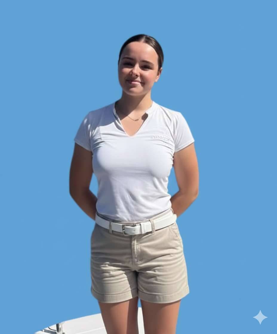 Deckhand: Fleur Azcuna. Fleur is a motivated and enthusiastic young professional in the yachting industry, combining strong service skills with solid deck experience. Holding her Captain 200 diploma, she brings a high level of responsibility, safety awareness, and seamanship to her role onboard.