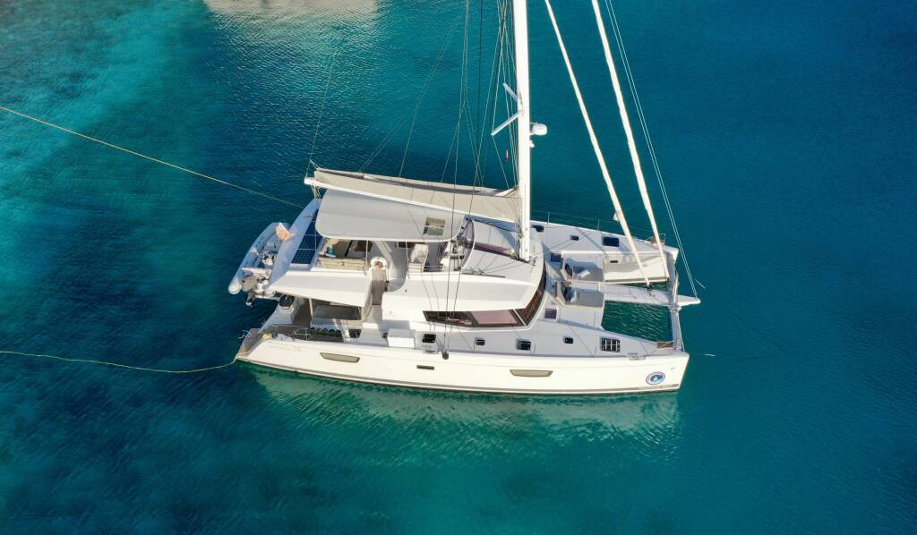 Luxus-Crew-Katamaran Olivia Charles, Baujahr 2018, liegt vor Anker in Caribbean Virgin Islands (BVI). Sie verfügt über 4 Kabinen und bietet Platz für 8 Personen.