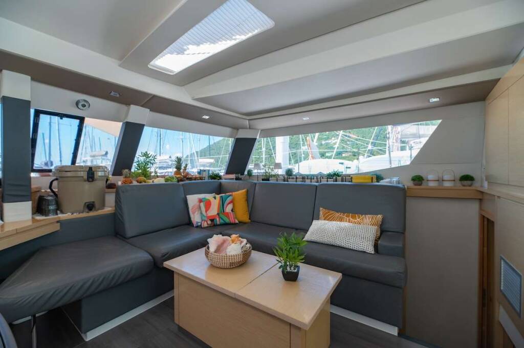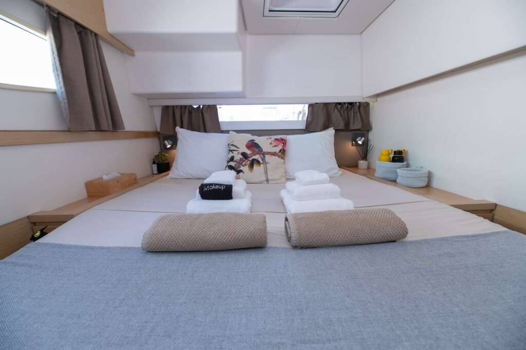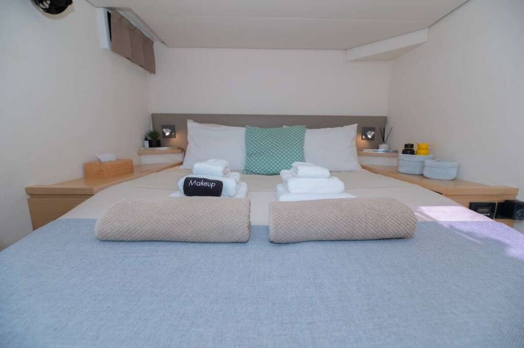 Luxus-Crew-Katamaran Purpose, Baujahr 2014, liegt vor Anker in South Pacific, French Polynesia. Sie verfügt über 5 Kabinen und bietet Platz für 8 Personen.