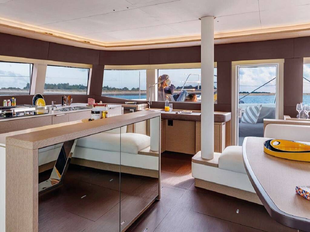 Luxus-Crew-Katamaran REVE BLEU, Baujahr 2023, liegt vor Anker in W. Med -Riviera/Cors/Sard.. Sie verfügt über 4 Kabinen und bietet Platz für 8 Personen.