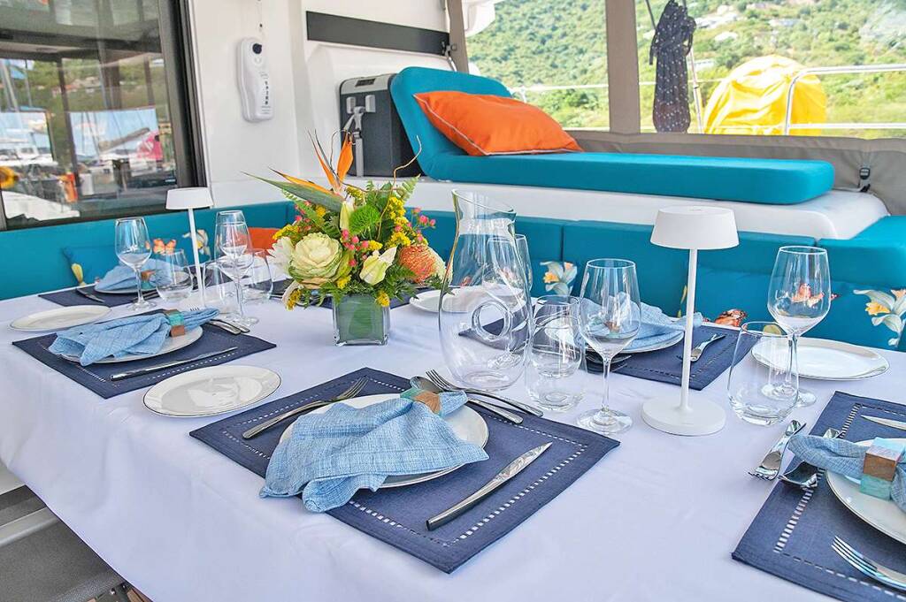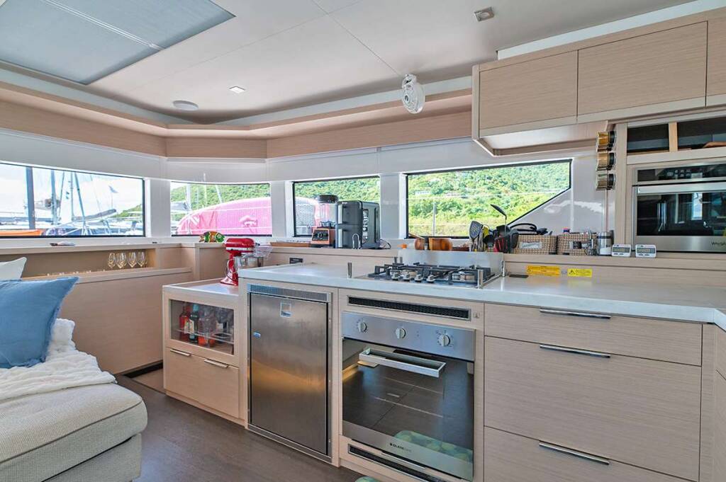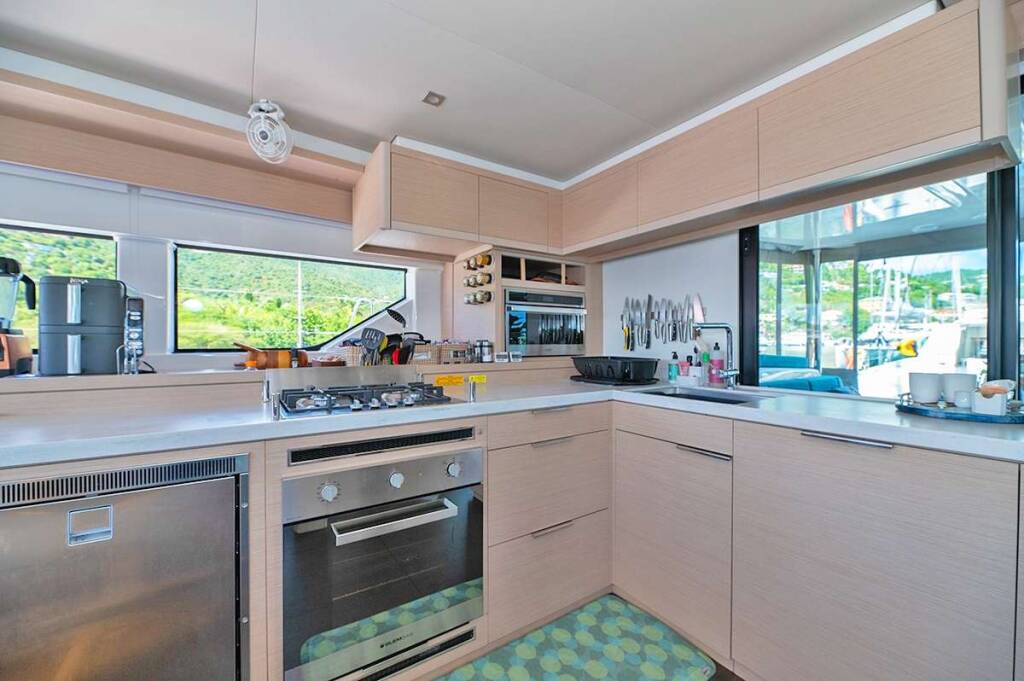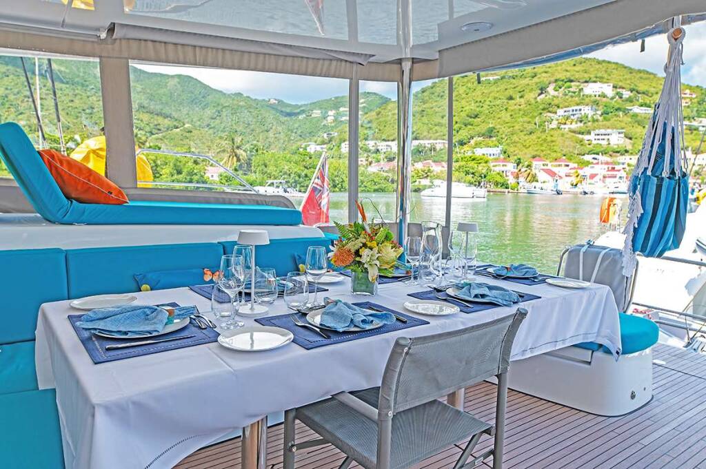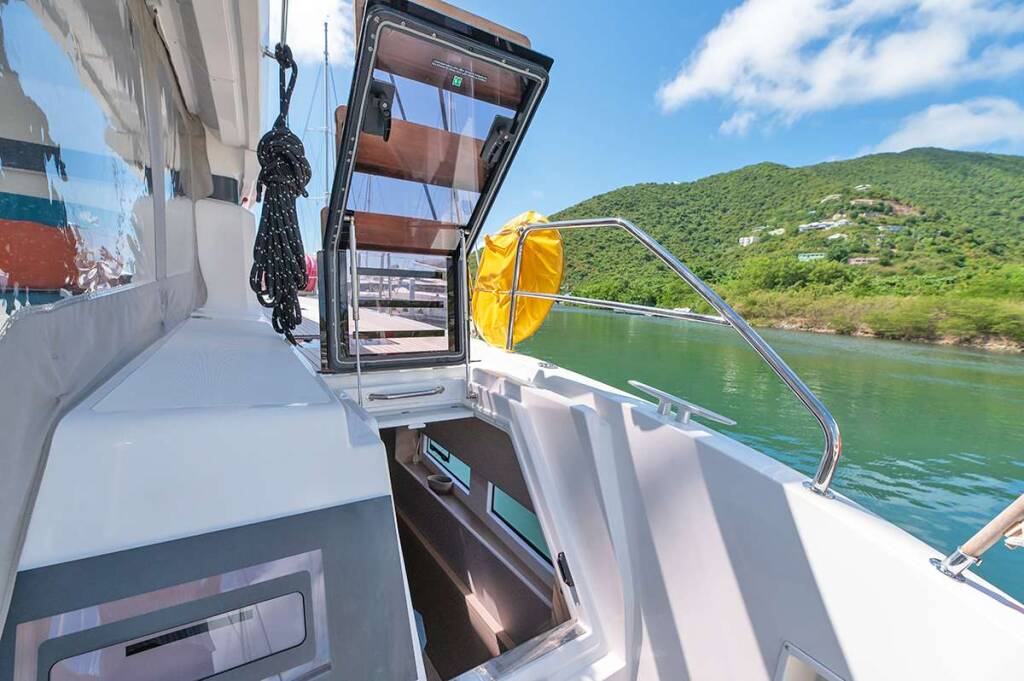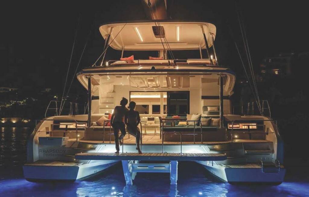 Luxus-Crew-Katamaran RHAPSODY II, Baujahr 2024, liegt vor Anker in Caribbean Virgin Islands (BVI). Sie verfügt über 4 Kabinen und bietet Platz für 8 Personen.