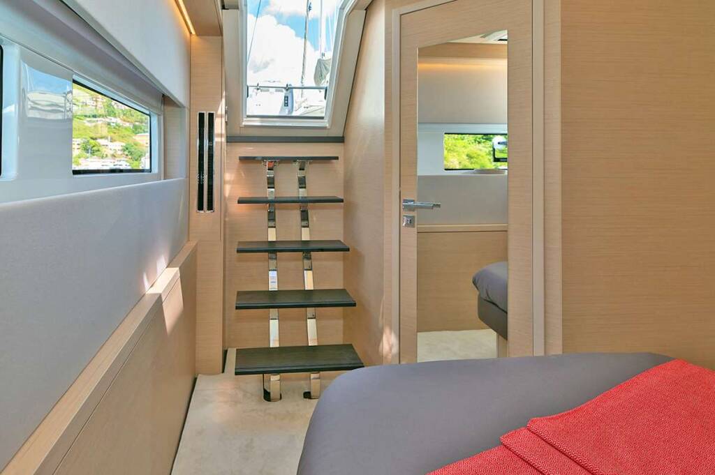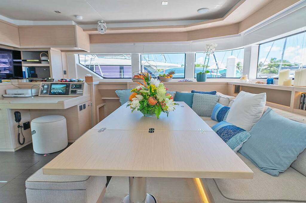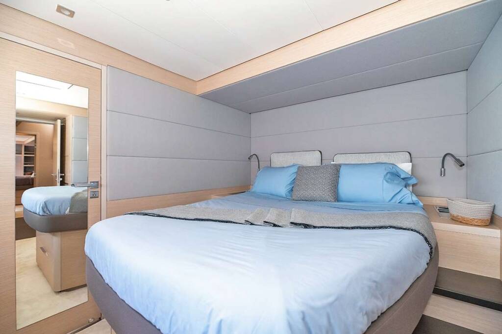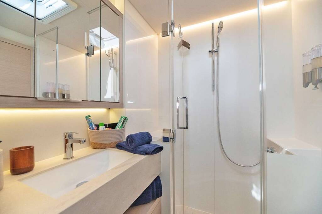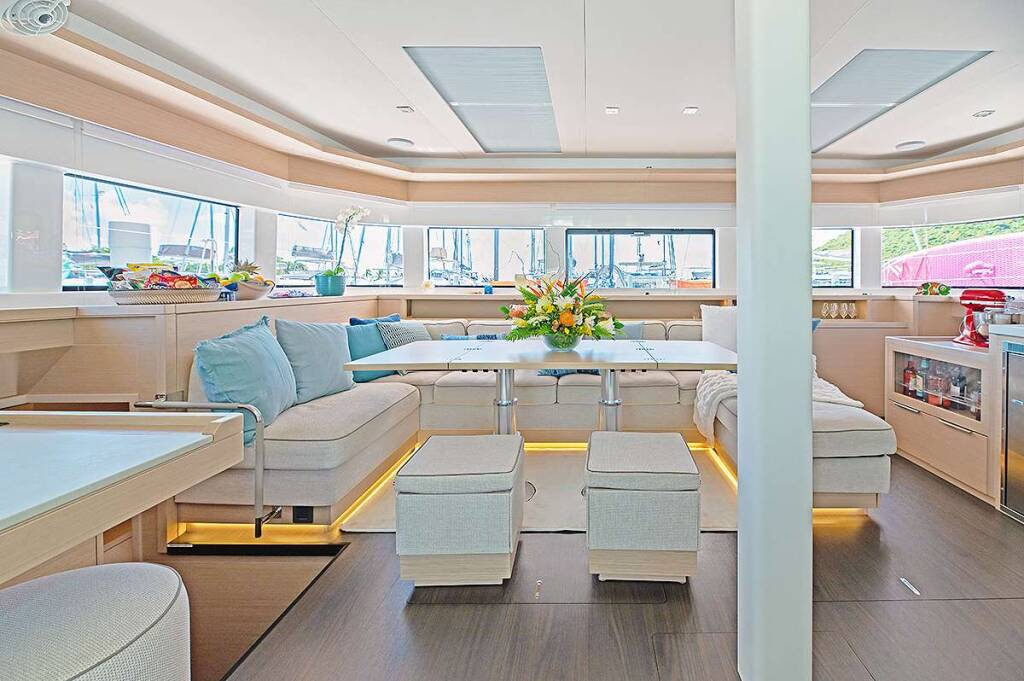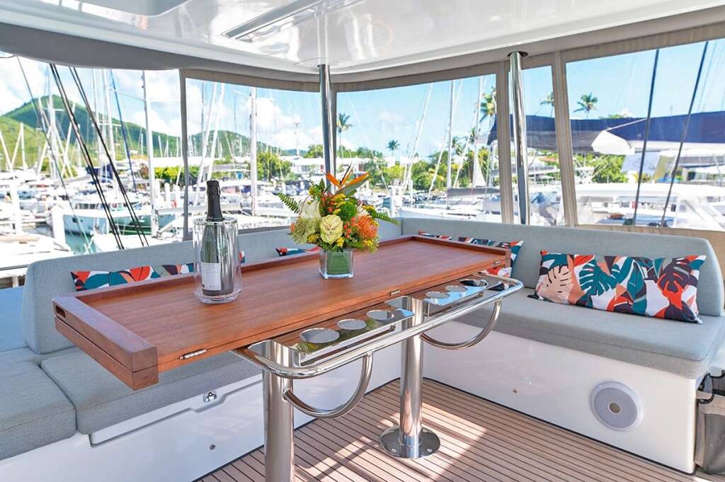 Luxus-Crew-Katamaran RHAPSODY II, Baujahr 2024, liegt vor Anker in Caribbean Virgin Islands (BVI). Sie verfügt über 4 Kabinen und bietet Platz für 8 Personen.