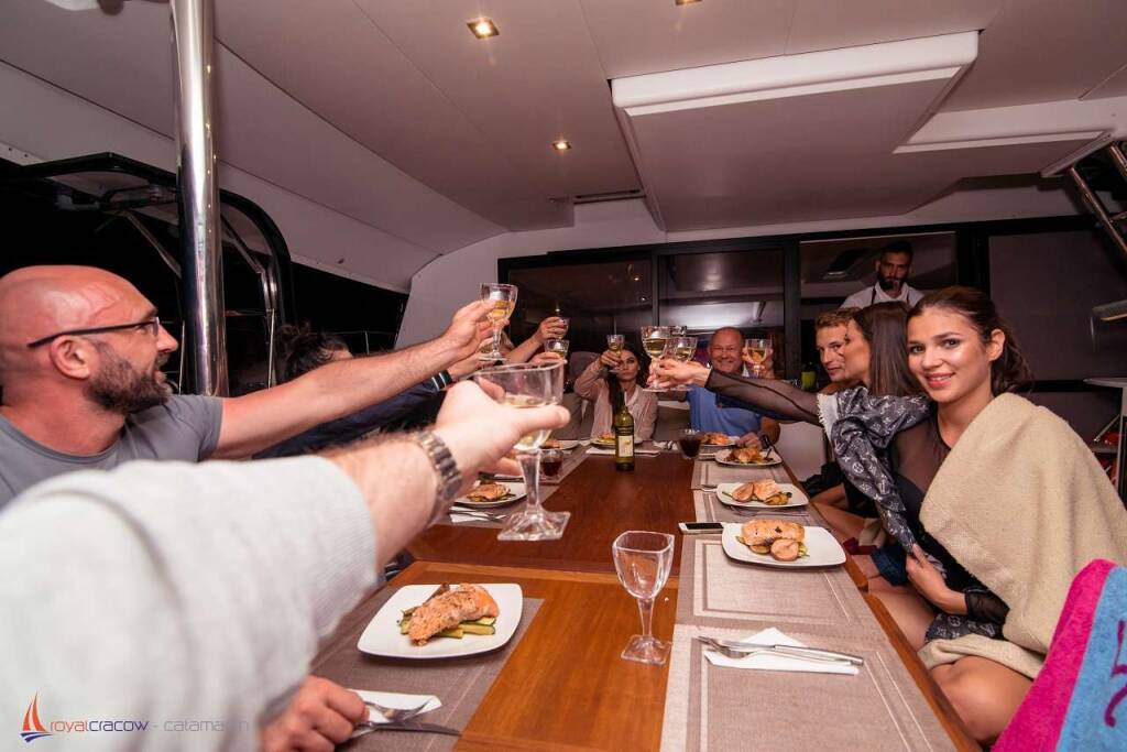Luxus-Crew-Katamaran ROYAL CRACOW, Baujahr 2016, liegt vor Anker in Croatia. Sie verfügt über 6 Kabinen und bietet Platz für 10 Personen.