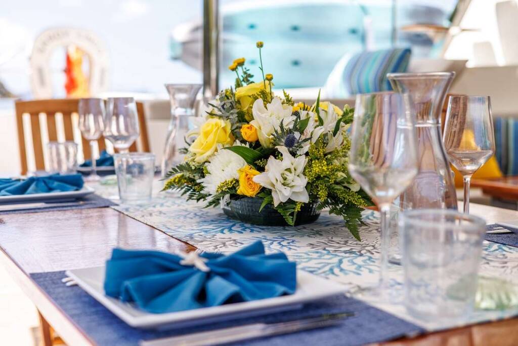 The fully covered flybridge is almost entirely for guest relaxation with comfortable shaded benches close to the drinks fridge and the bar and offers wonderful views when sailing or at anchor.