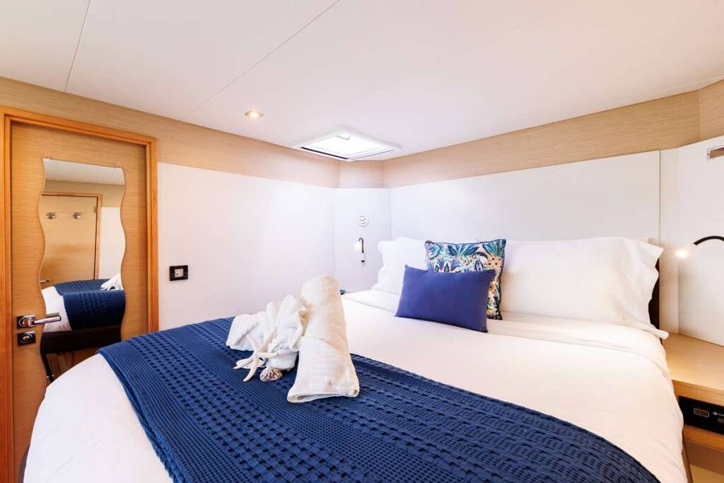Sandy Cinco sleeps eight guests in 4 beautiful ensuite cabins: the king-size primary suite and three queen VIP suites.