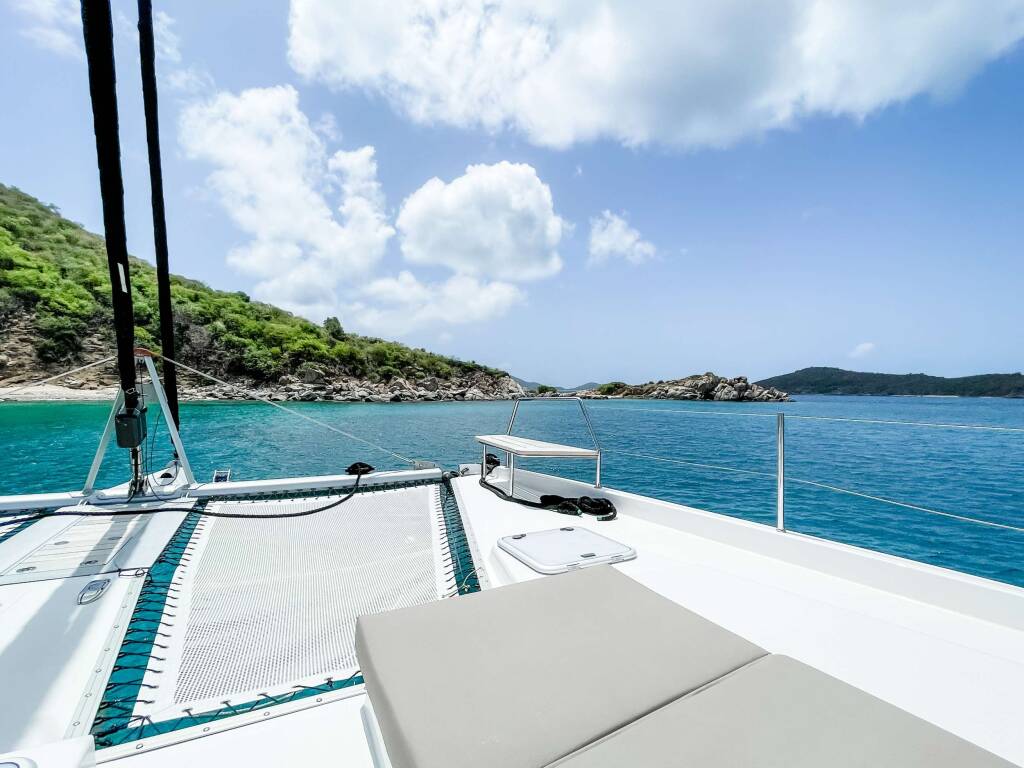 Luxus-Crew-Katamaran SEVEN, Baujahr 2023, liegt vor Anker in Caribbean Virgin Islands (BVI). Sie verfügt über 5 Kabinen und bietet Platz für 10 Personen.