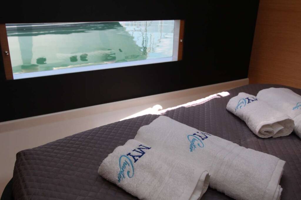 Luxus-Crew-Katamaran SUALZO, Baujahr 2022, liegt vor Anker in W. Med -Naples/Sicily. Sie verfügt über 5 Kabinen und bietet Platz für 12 Personen.