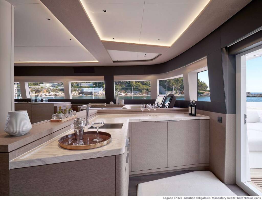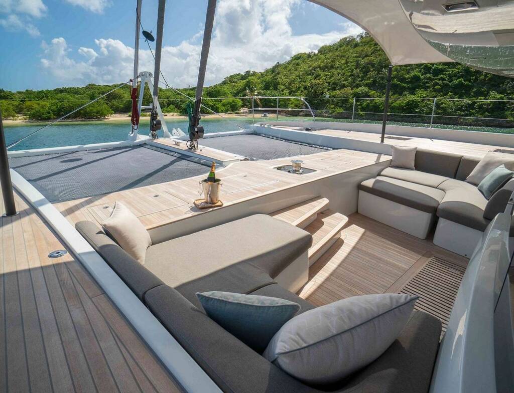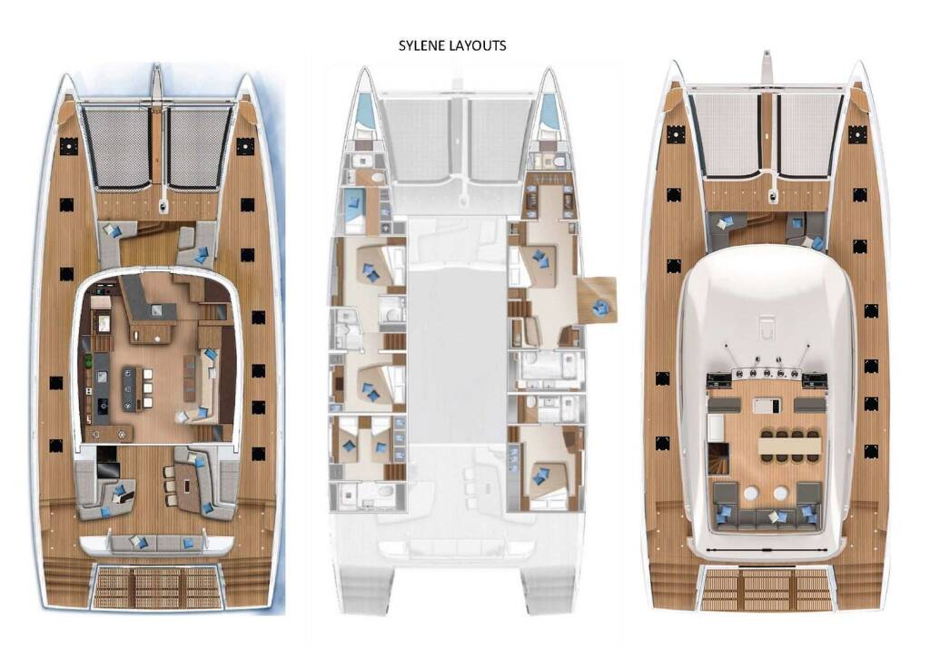 Luxus-Crew-Katamaran SYLENE, Baujahr 2022, liegt vor Anker in W. Med -Naples/Sicily, W. Med -Riviera/Cors/Sard.. Sie verfügt über 5 Kabinen und bietet Platz für 10 Personen.