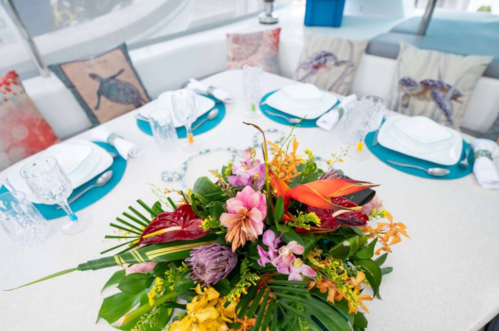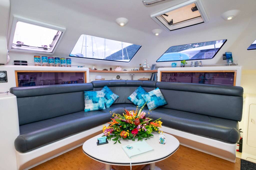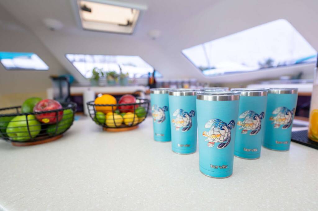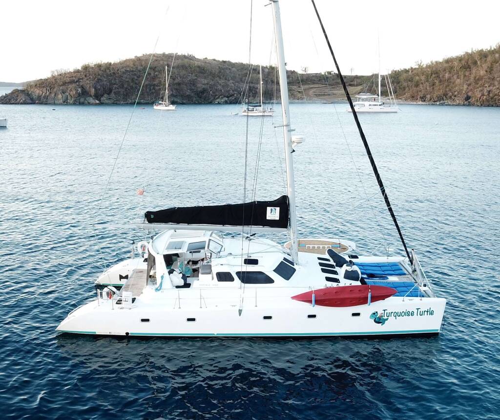 Luxus-Crew-Katamaran TURQUOISE TURTLE, Baujahr 2001, liegt vor Anker in Caribbean Windwards, Caribbean Virgin Islands (BVI). Sie verfügt über 3 Kabinen und bietet Platz für 6 Personen.