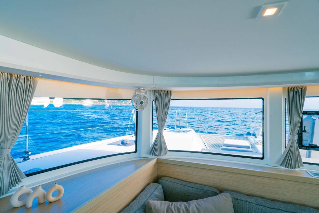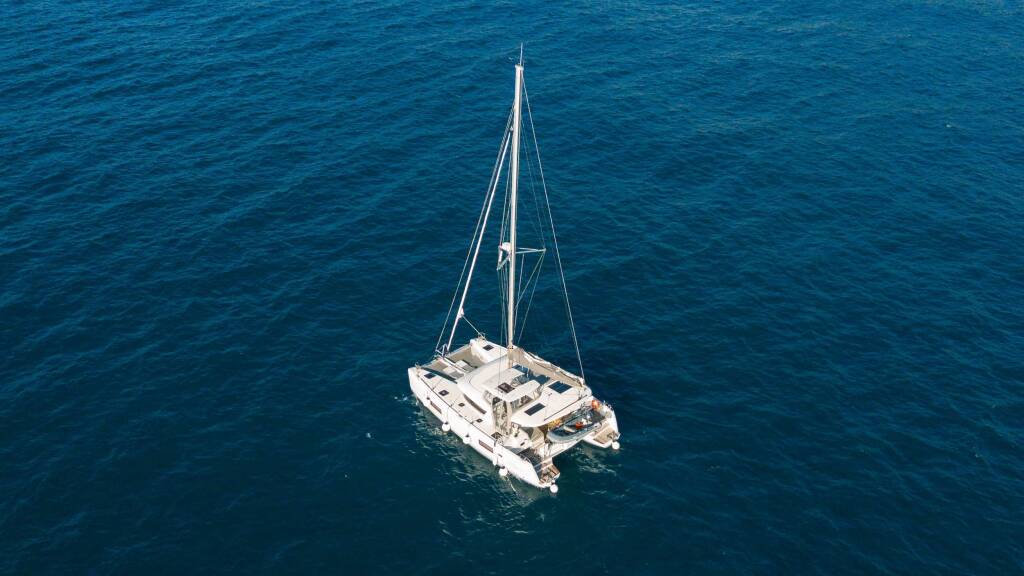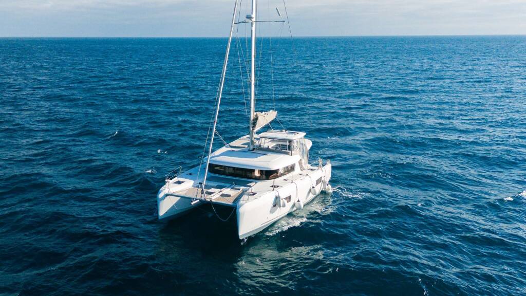 Luxus-Crew-Katamaran Veryta, Baujahr 2024, liegt vor Anker in W. Med -Riviera/Cors/Sard.. Sie verfügt über 4 Kabinen und bietet Platz für 8 Personen.