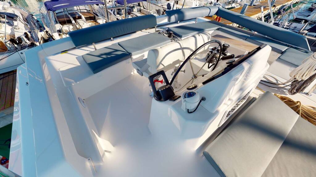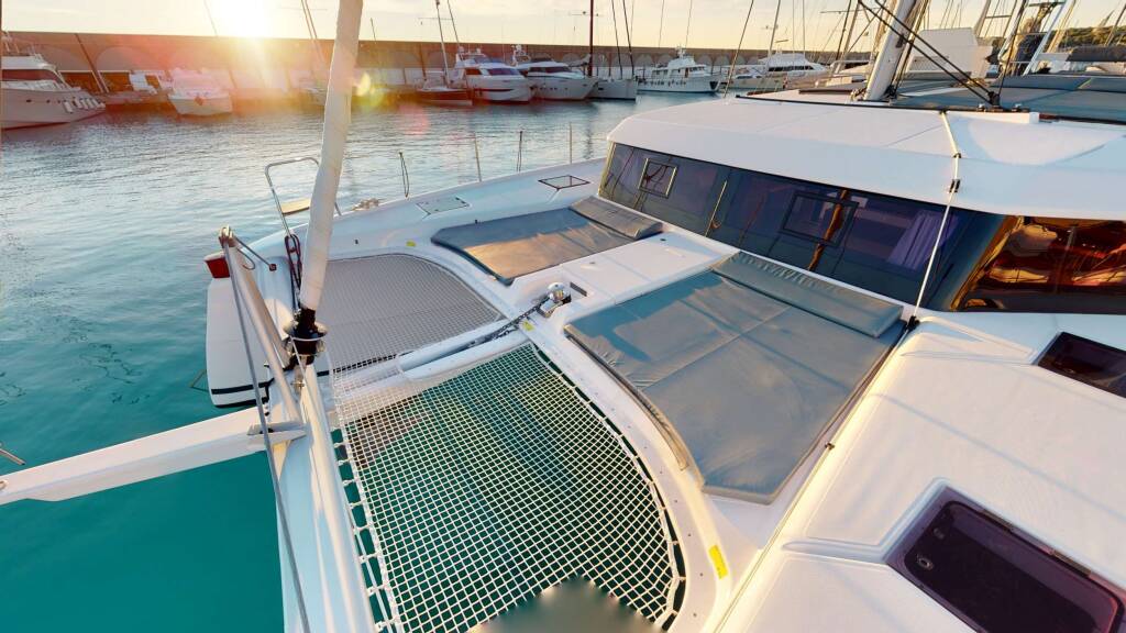 Luxus-Crew-Katamaran Vittoria, Baujahr 2021, liegt vor Anker in W. Med -Naples/Sicily. Sie verfügt über 4 Kabinen und bietet Platz für 10 Personen.