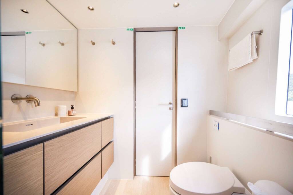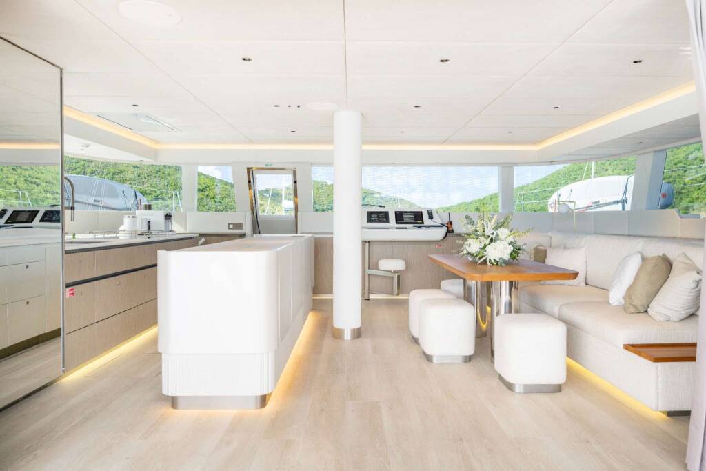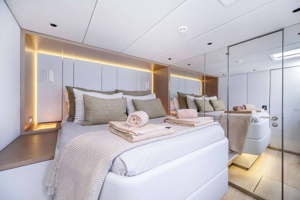 Luxus-Crew-Katamaran VIVI, Baujahr 2024, liegt vor Anker in Caribbean Virgin Islands (BVI). Sie verfügt über 4 Kabinen und bietet Platz für 8 Personen.