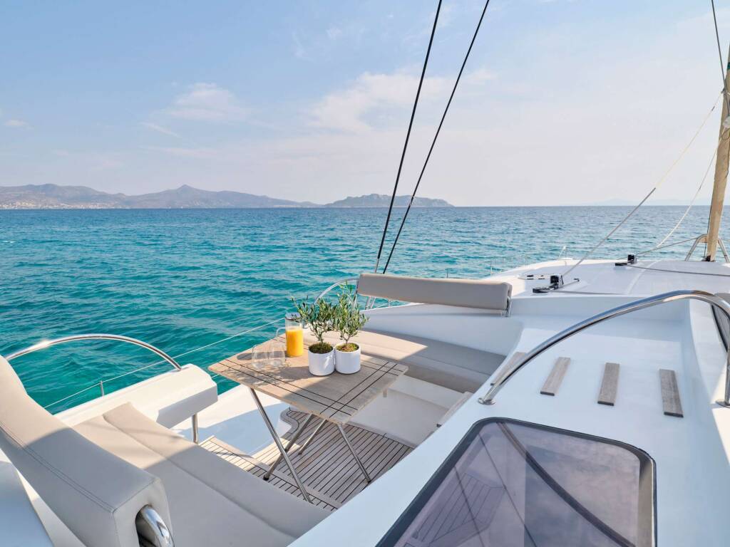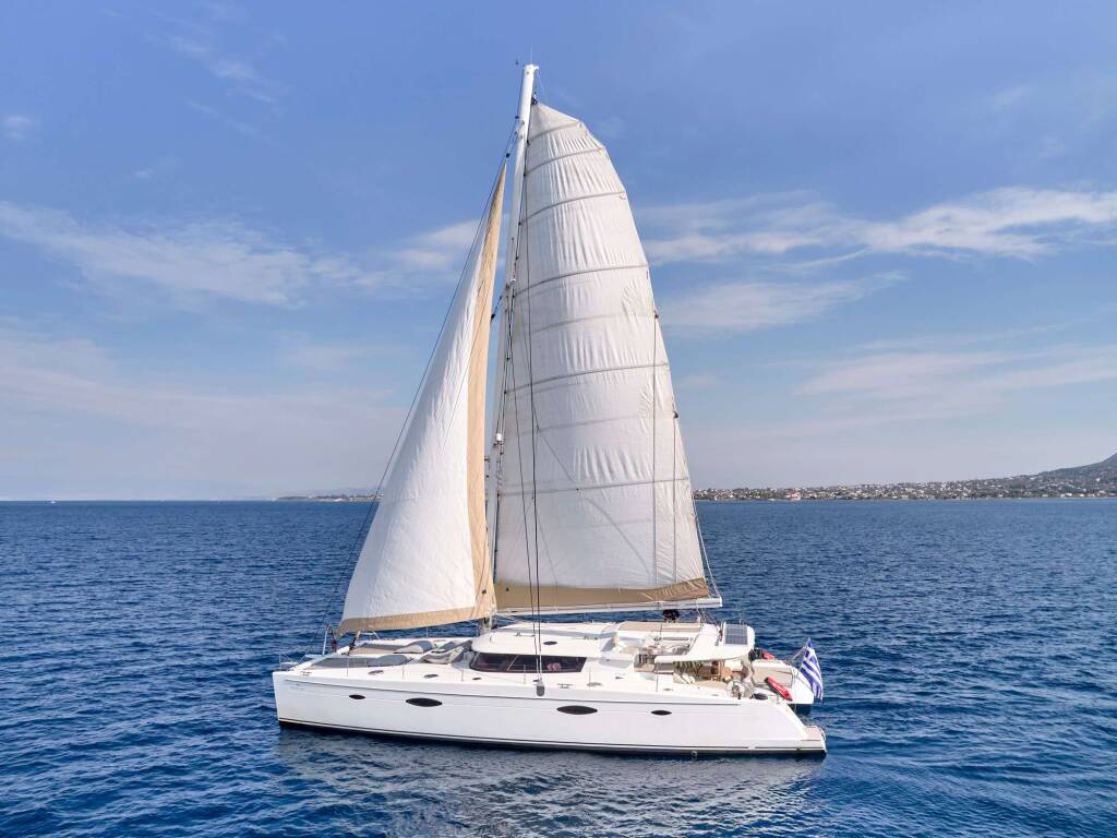 Luxus-Crew-Katamaran WORLD'S END (MED), Baujahr 2011, liegt vor Anker in Greece. Sie verfügt über 5 Kabinen und bietet Platz für 10 Personen.