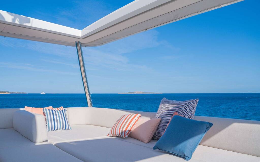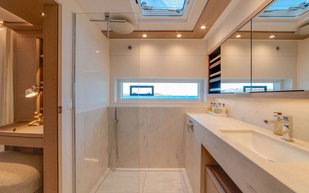 Luxus-Crew-Katamaran ZENIT, Baujahr 2024, liegt vor Anker in W. Med -Naples/Sicily, Greece. Sie verfügt über 4 Kabinen und bietet Platz für 8 Personen.