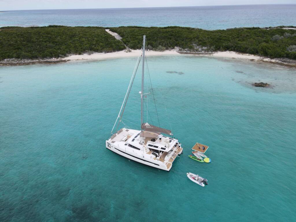 Luxus-Crew-Katamaran ZURI 3, Baujahr 2021, liegt vor Anker in Bahamas. Sie verfügt über 3 Kabinen und bietet Platz für 6 Personen.