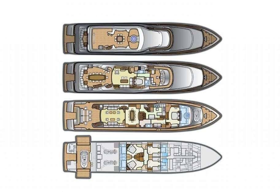 1 Master suite, 2 VIP cabins, 1 Double cabin, 2 Double cabins each with a Pullman bed