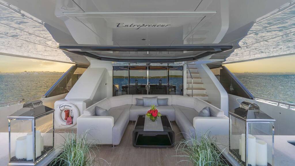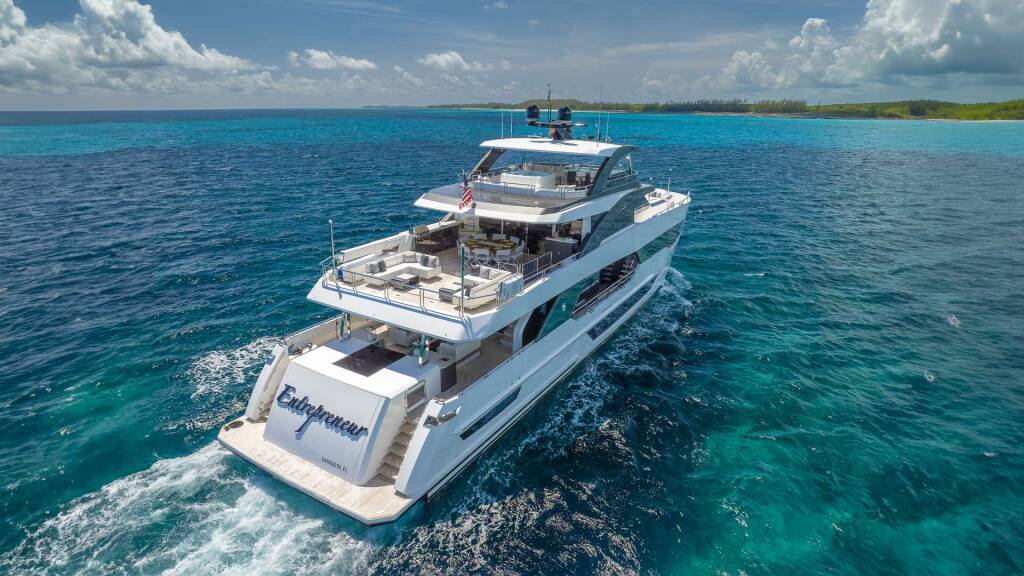 Luxus-Motoryacht ENTREPRENEUR, Baujahr 2021, liegt vor Anker in Bahamas, USA - New England. Sie verfügt über 5 Kabinen und bietet Platz für 10 Personen.