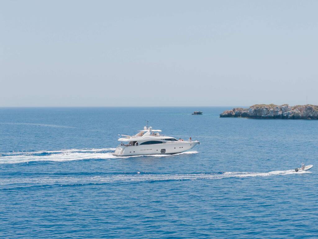 Luxus-Motoryacht NATASSA ( ex LADY NATASA), Baujahr 2007, liegt vor Anker in Greece. Sie verfügt über 4 Kabinen und bietet Platz für 8 Personen.