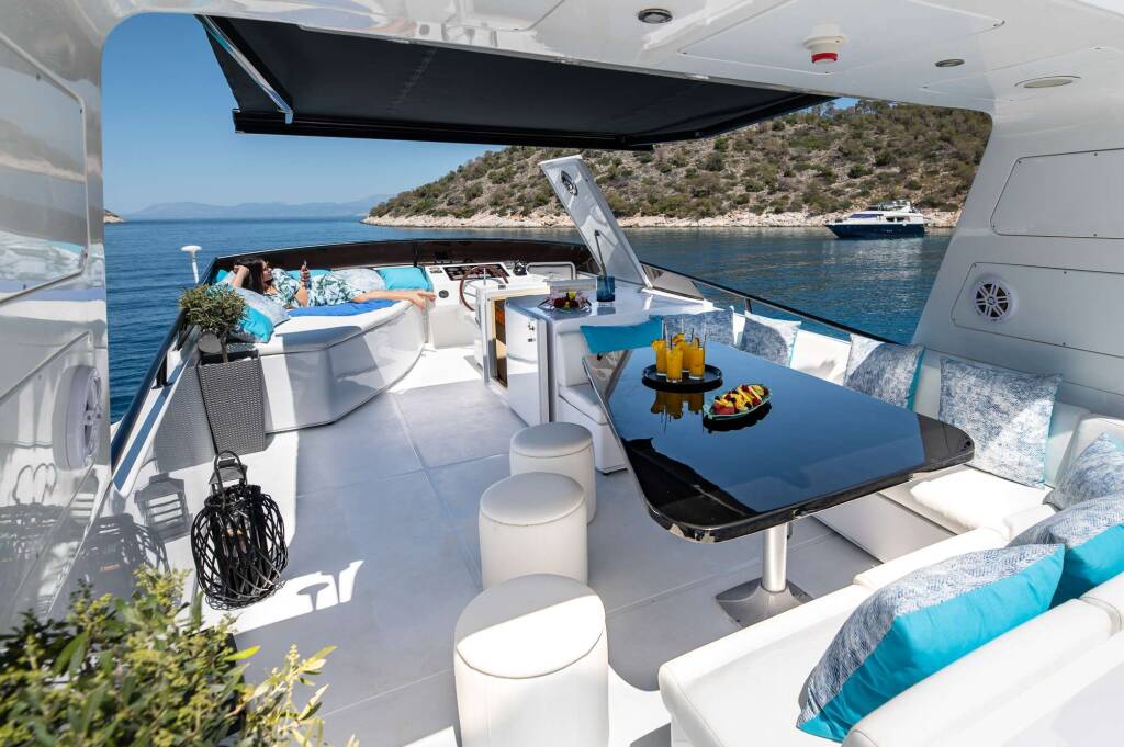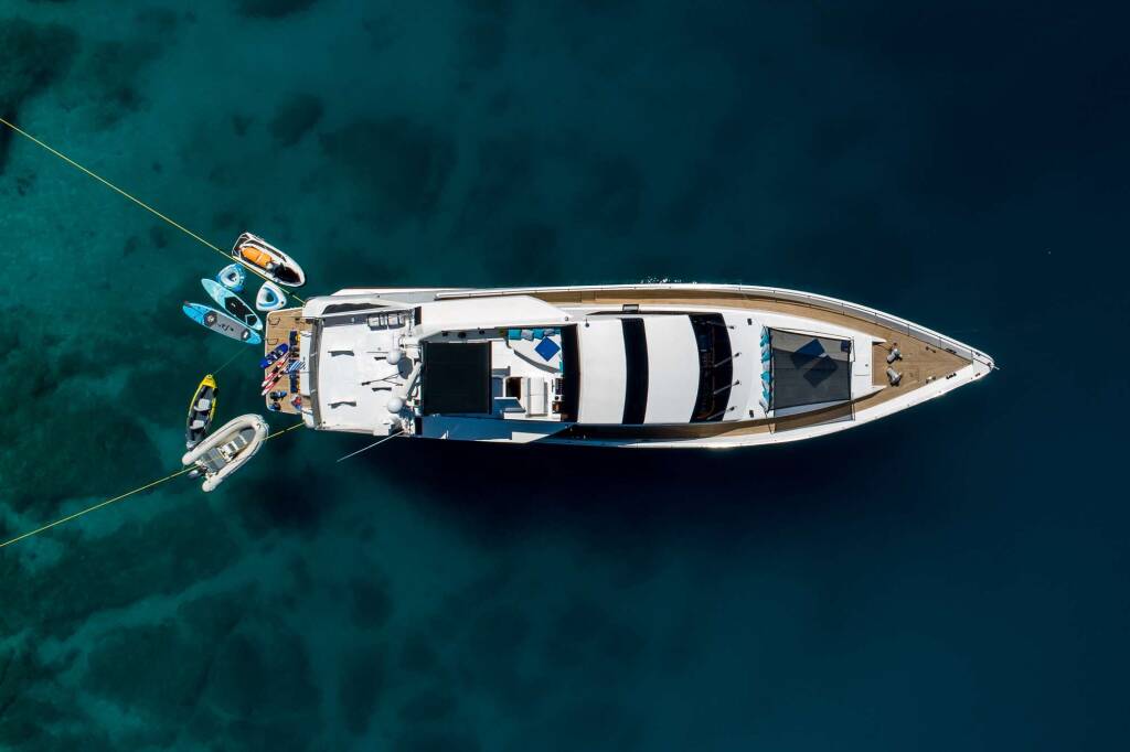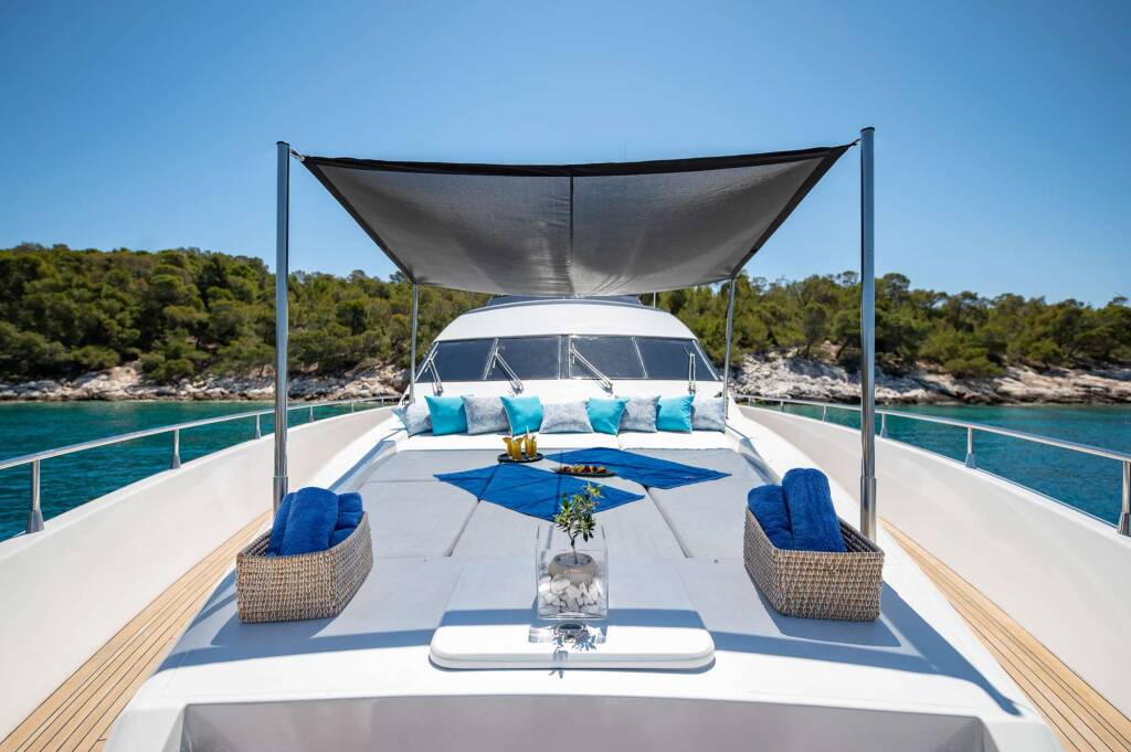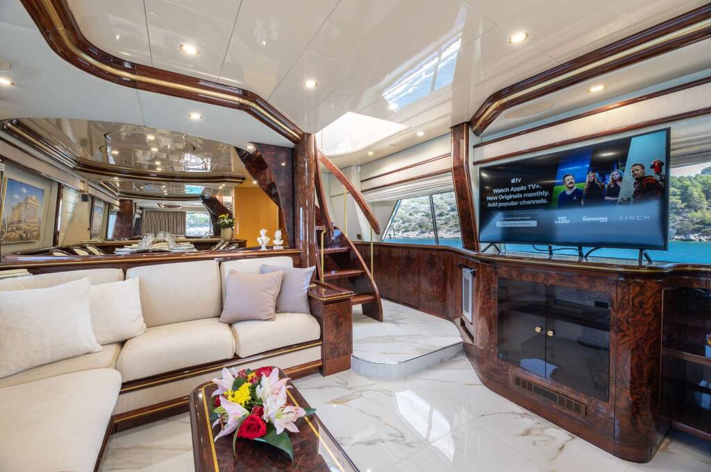 Luxus-Motoryacht WISH, Baujahr 1997, liegt vor Anker in Greece. Sie verfügt über 4 Kabinen und bietet Platz für 10 Personen.