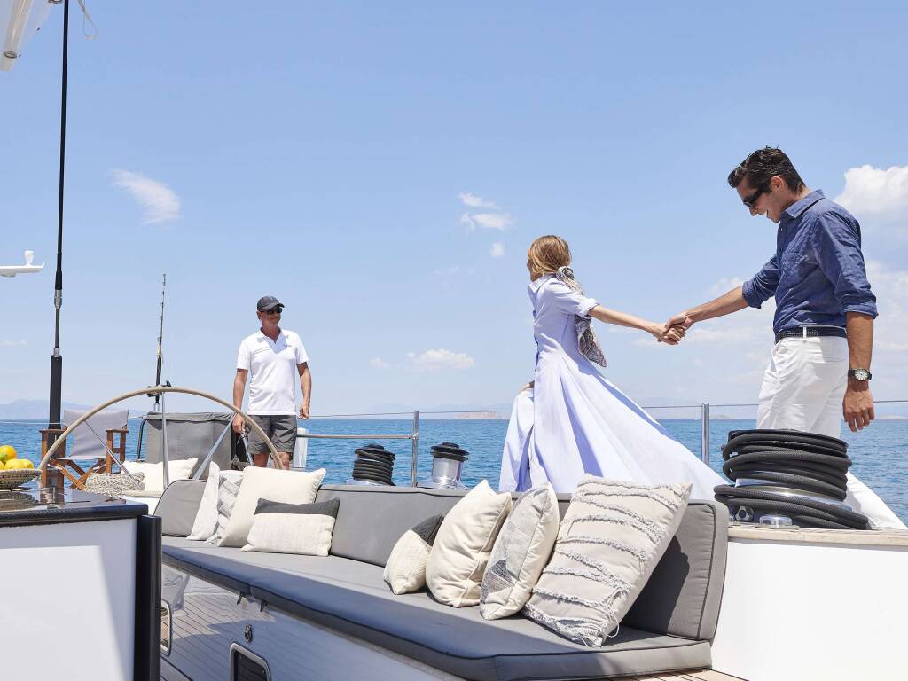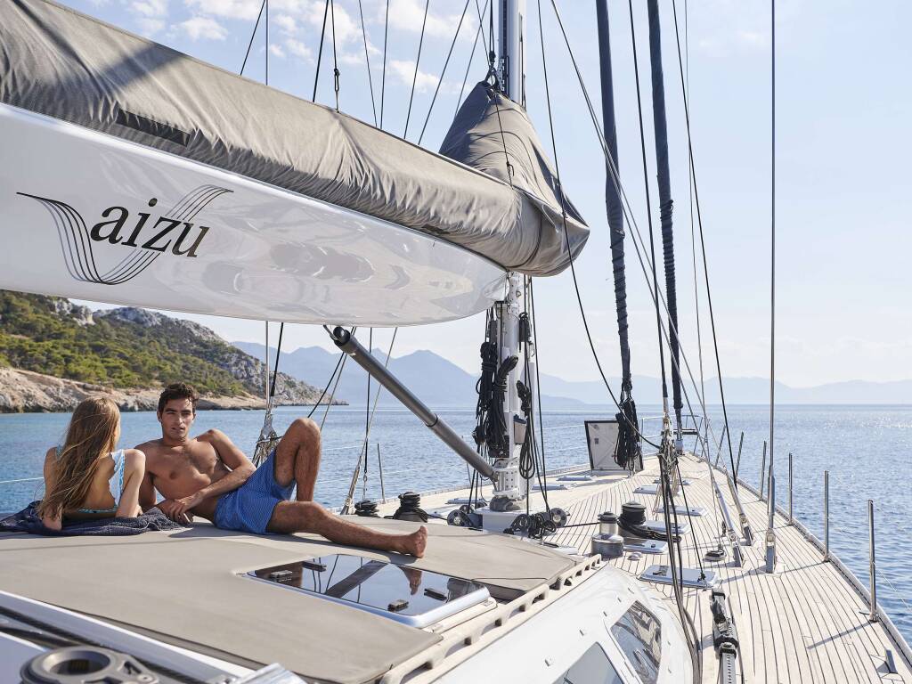 Luxus-Segelyacht AIZU, Baujahr 1989, liegt vor Anker in Greece. Sie verfügt über 4 Kabinen und bietet Platz für 8 Personen.