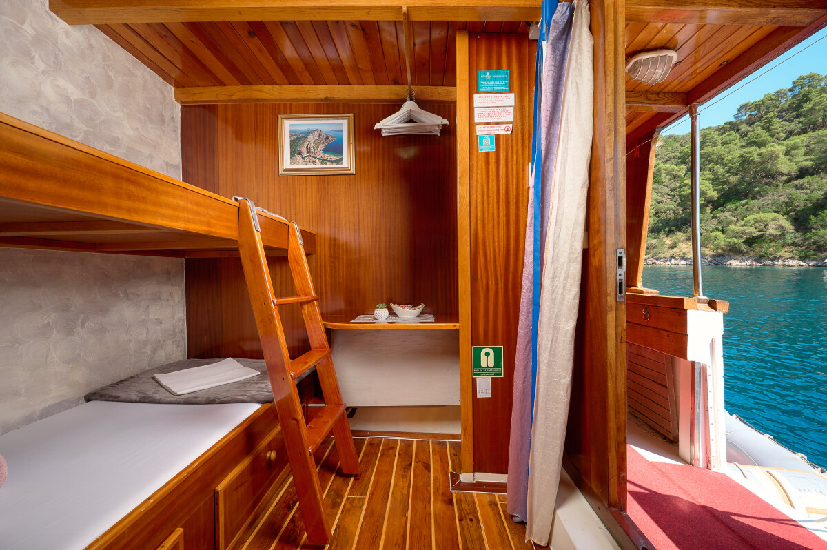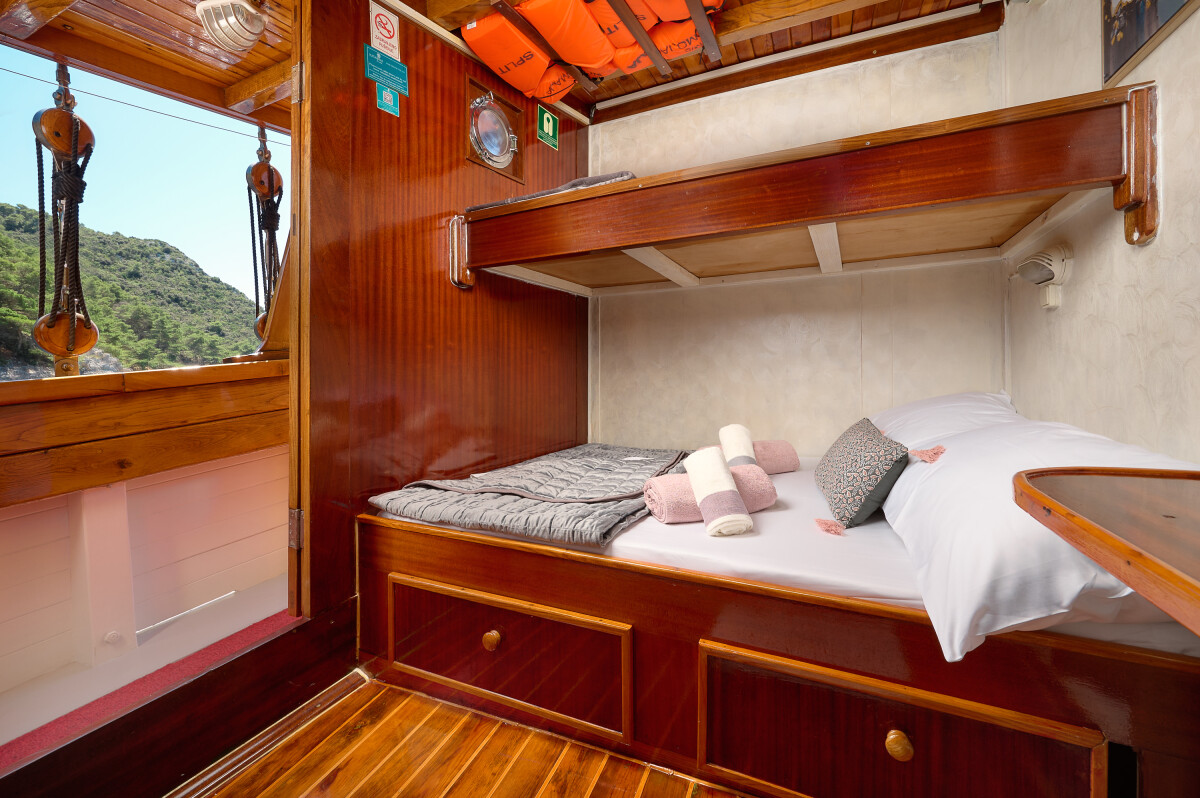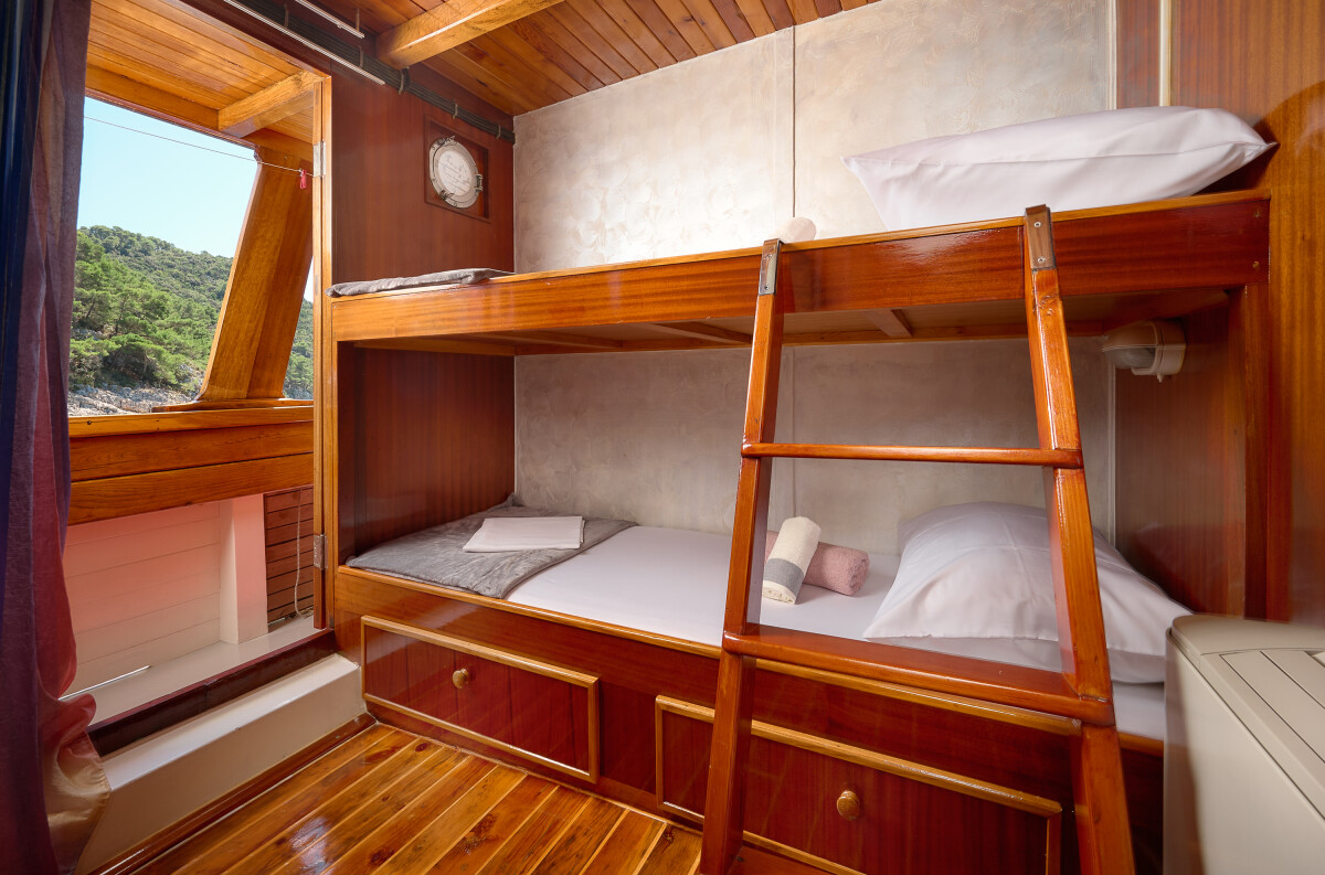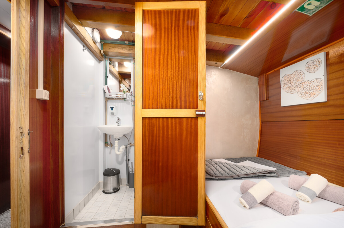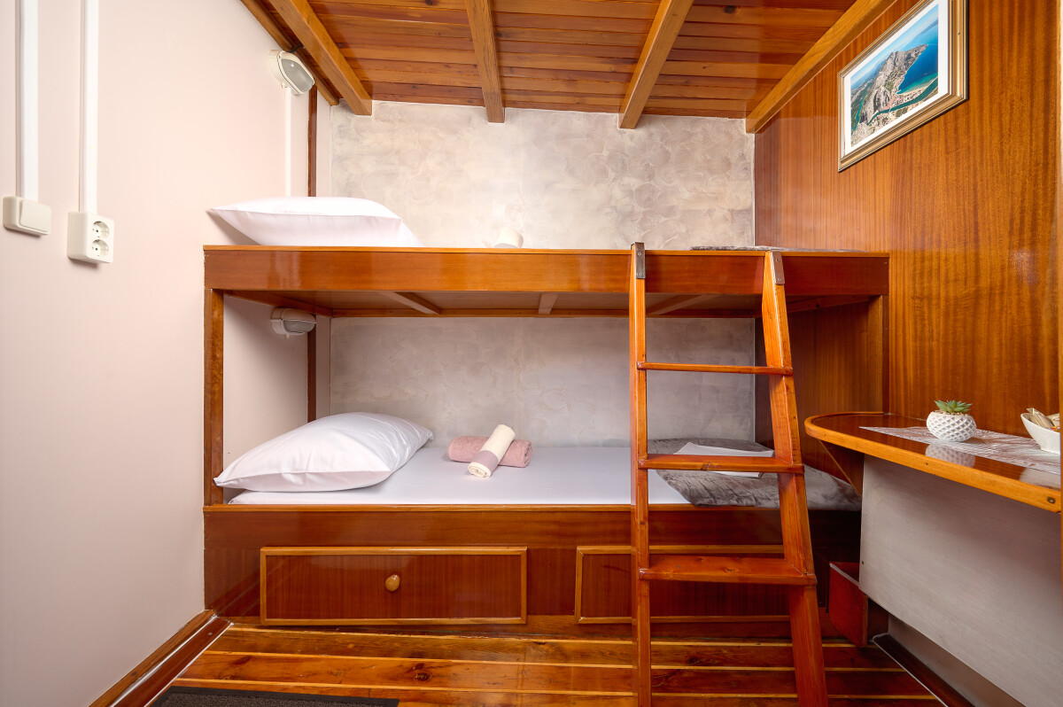 The vessel can accommodate up to 24 guests in 12 cabins, located on the main and lower decks. Most cabins are designed for two guests, either with bunk beds or a double bed. For families traveling with a child, there are two triple cabins featuring a double bed and an additional bunk bed.