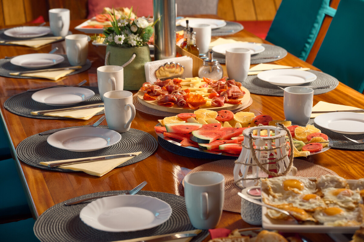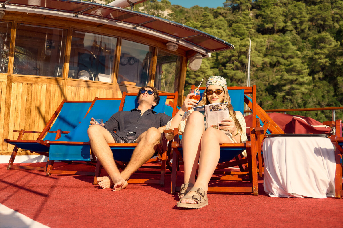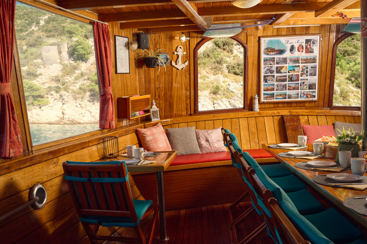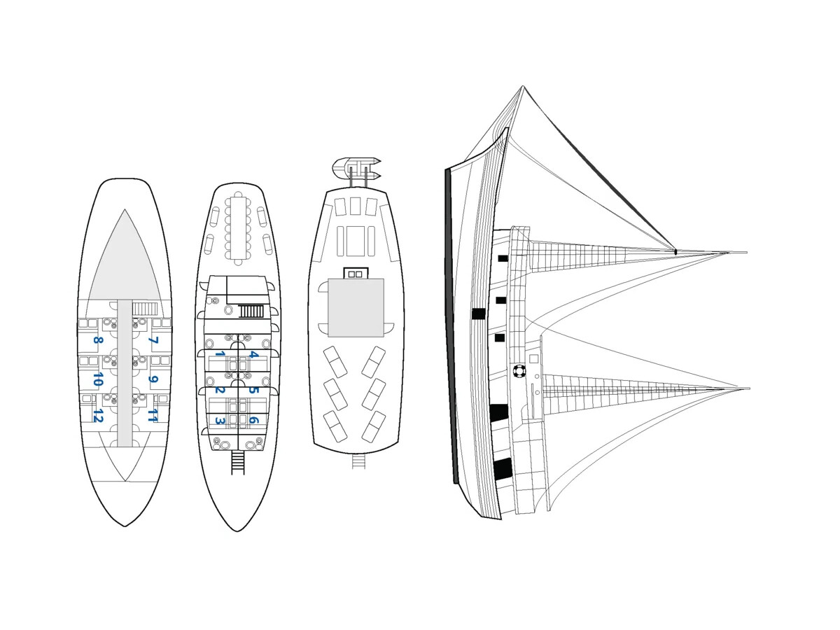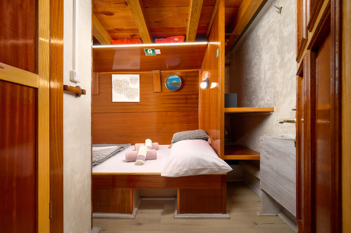 The vessel can accommodate up to 24 guests in 12 cabins, located on the main and lower decks. Most cabins are designed for two guests, either with bunk beds or a double bed. For families traveling with a child, there are two triple cabins featuring a double bed and an additional bunk bed.
