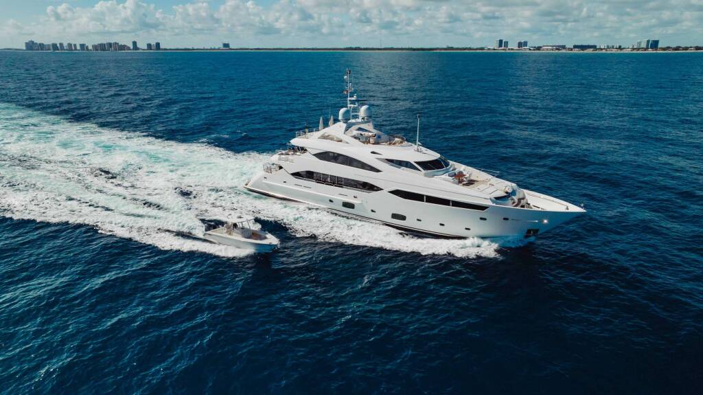 Luxury motor yacht ABOUT TIME, built in 2010 is anchored in the Bahamas. It has 6 cabins, can accommodate 12 people.