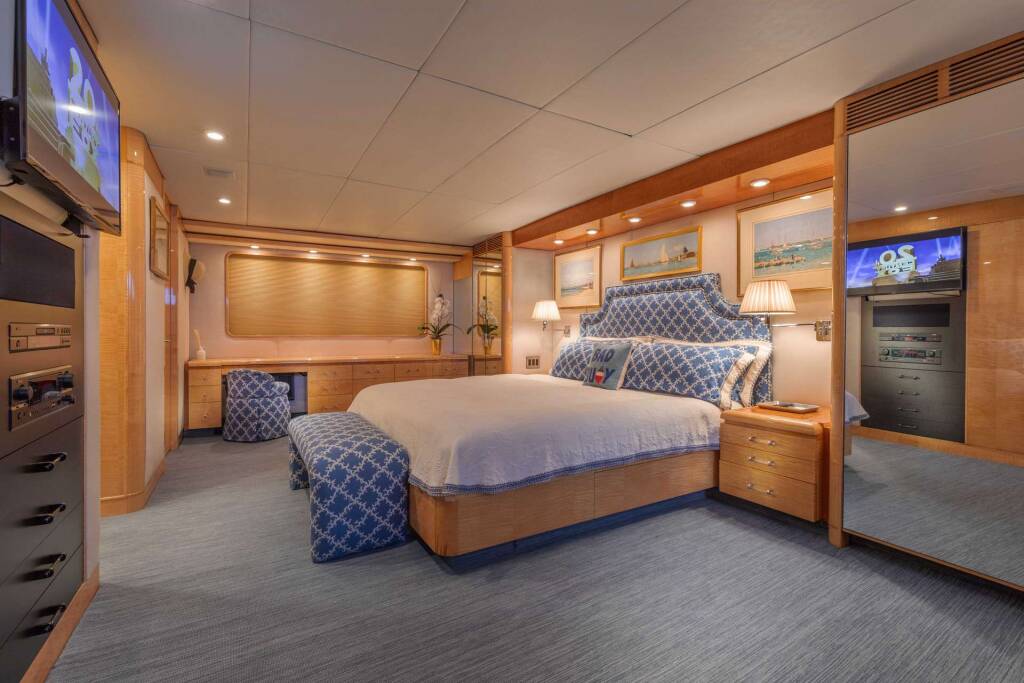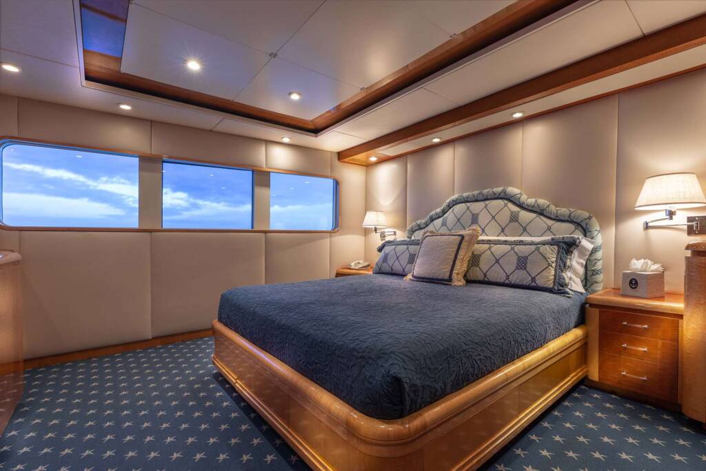 The master stateroom is full width below with a King Size bed and Jacuzzi Tub.