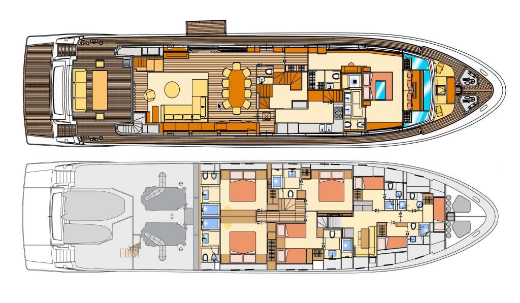 The Owner suite on the main deck, three double cabins and a twin cabin on the lower deck. All cabins are ensuite.