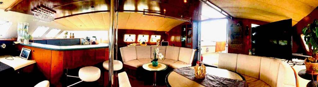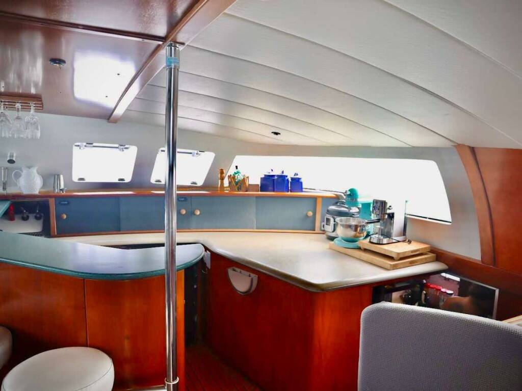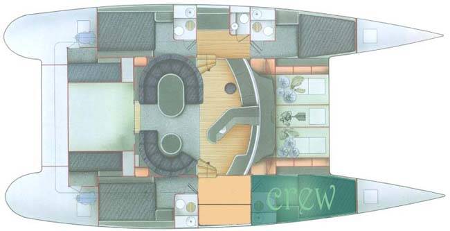 Accommodation: Three staterooms with en suite head and combination shower. The two aft staterooms have queen sized beds while the forward stateroom bed measures 58 inches on one end and tapers to 43 inches at the other (not quite a queen but larger than a double). All beds have 3 inch memory foam toppers.