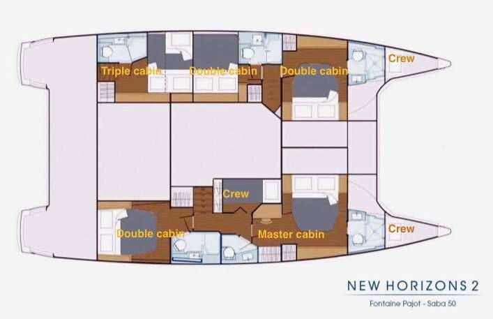 Catamarán de lujo con tripulación NEW HORIZONS 2, construido en 2016, está anclado en Greece. Tiene 5 camarotes y puede alojar a 11 personas.