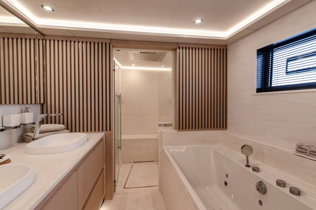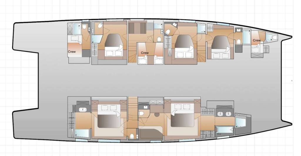 Accommodation: One owner's suite with jacuzzi bathtub and separate shower (bed size 1,80 m x 2,00 m, 32 m²), one VIP cabin with desk area (bed size 1,80 m x 2,00 m, 22 m²), and three queen bed cabins (bed size 1,60 m x 2,00 m, 14 m² approx.), all with private facilities.