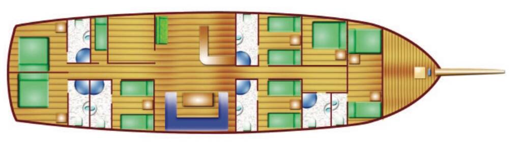 • Separate crew+capt. cabins with WC/shower • Indoor-outdoor dining • Fully equipped galley
