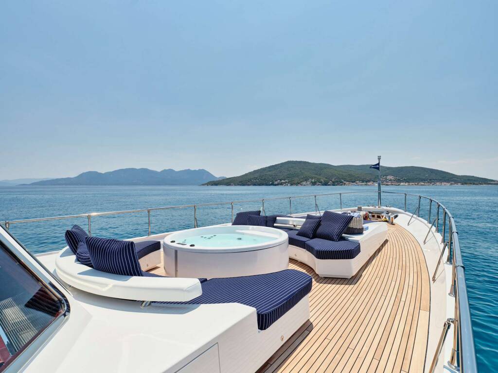 accessible by stairs at midship and includes a full beam master with king size bed (190×180cm) and a sofa (185×70cm) with en-suite, and 2 VIP cabins, bed dimensions port cabin 190x135 and starboard 200x138. The forward section is accessible by stairs from the dining room