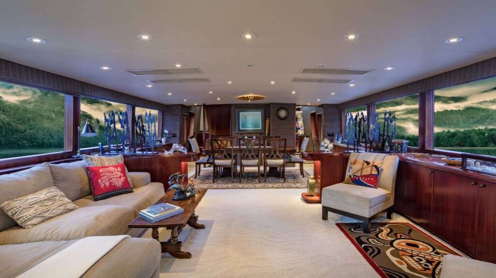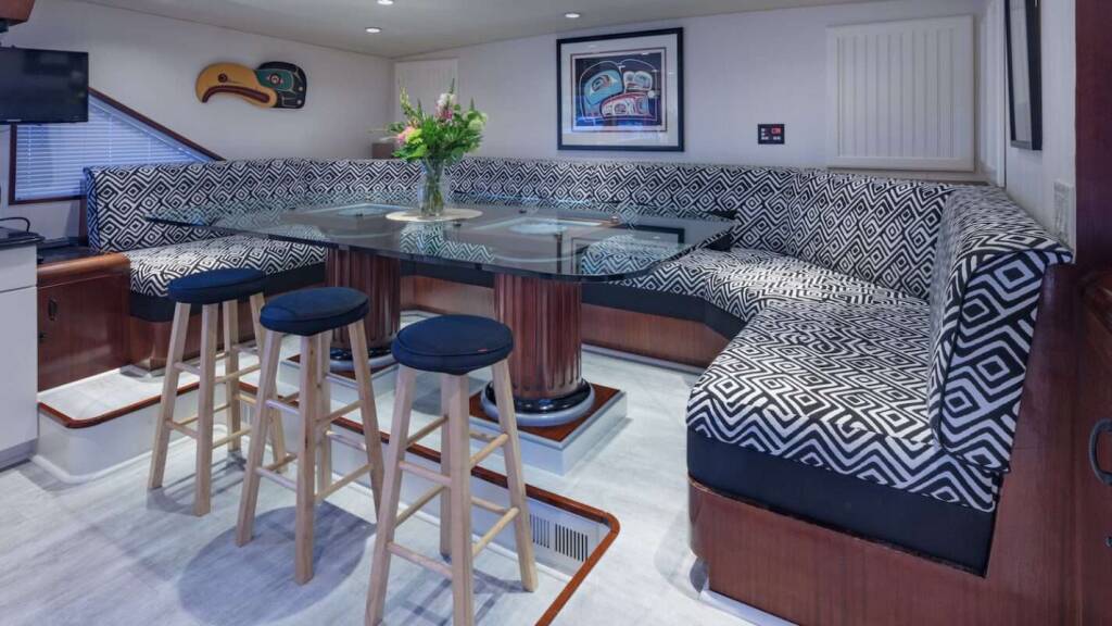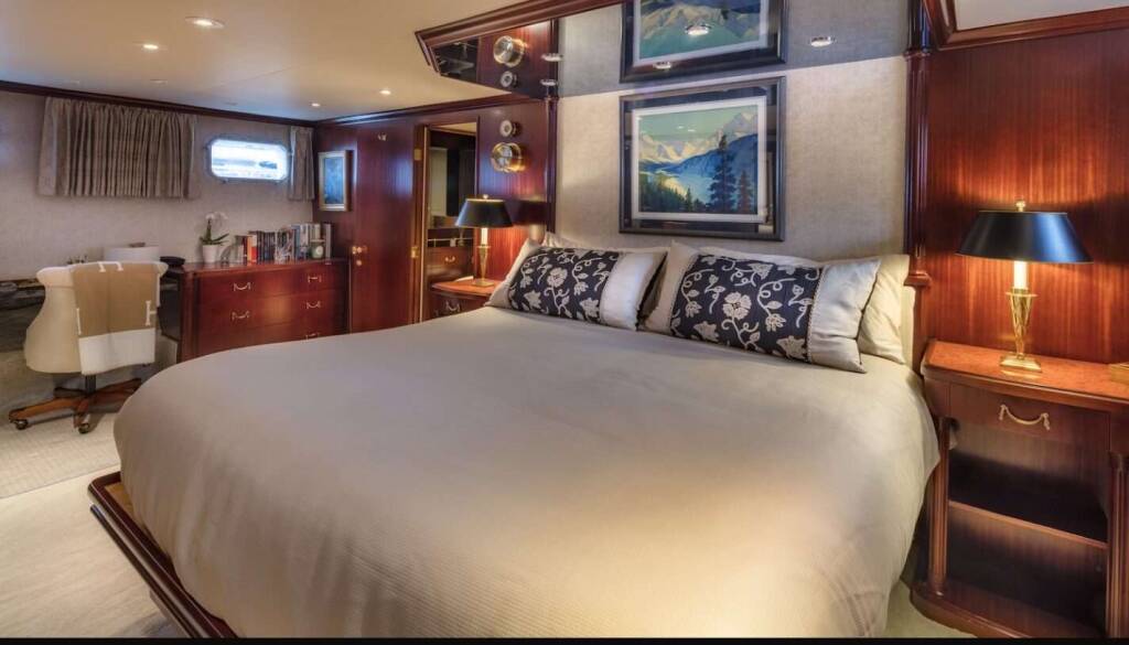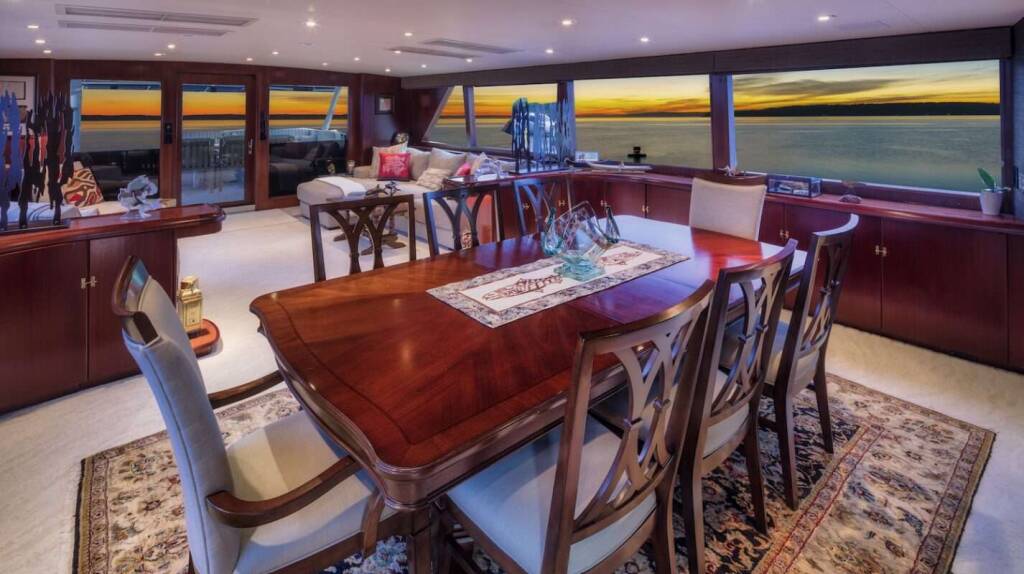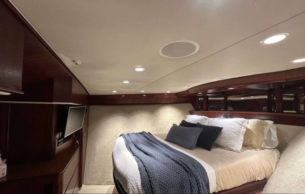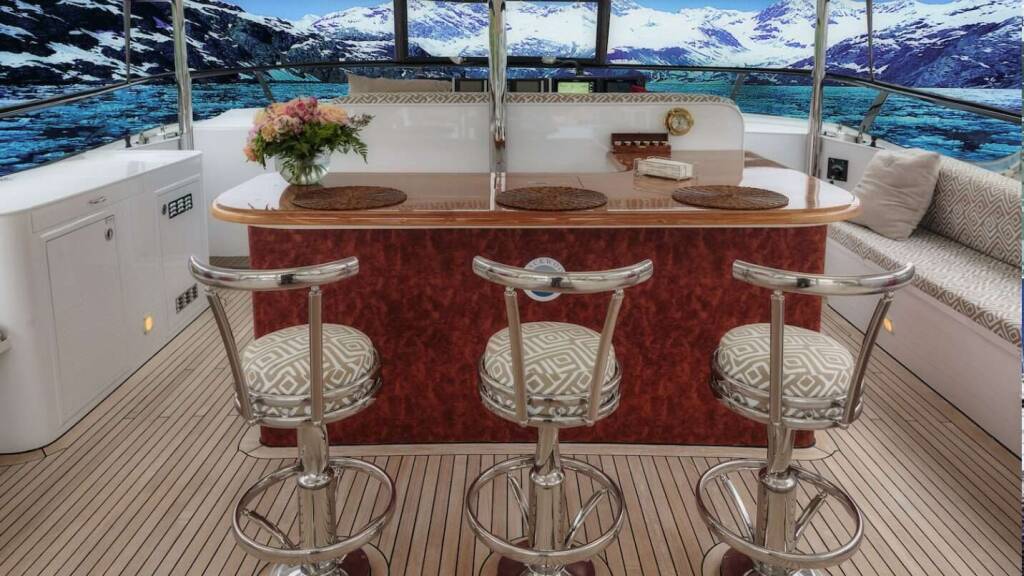 The expansive flybridge features lounge beds, a full bar, grill, and a Ukiah firepit for day-to-night enjoyment. A Fusion sound system, streaming services, and Starlink internet keep guests connected and entertained. Air conditioning and Kabola heating provide year-round climate comfort.