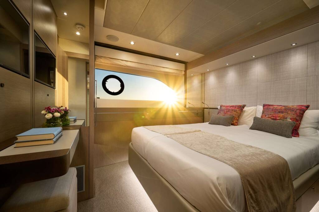 Accommodation: 4 luxurious cabins fitted out in a modern, calming ascetic which gives a cool, light and airy impression, emphasising the ingress of natural light. The full beam master cabin is large, with a 3 section wardrobe, vanity unit and en-suite bathroom complete with his and hers sinks. The forward VIP has a lovely feel, spacious and capacious, with great storage, a vanity unit and en-suite. Both midships cabins are en-suite, with a double to starboard and a twin to port (can be converted to double).