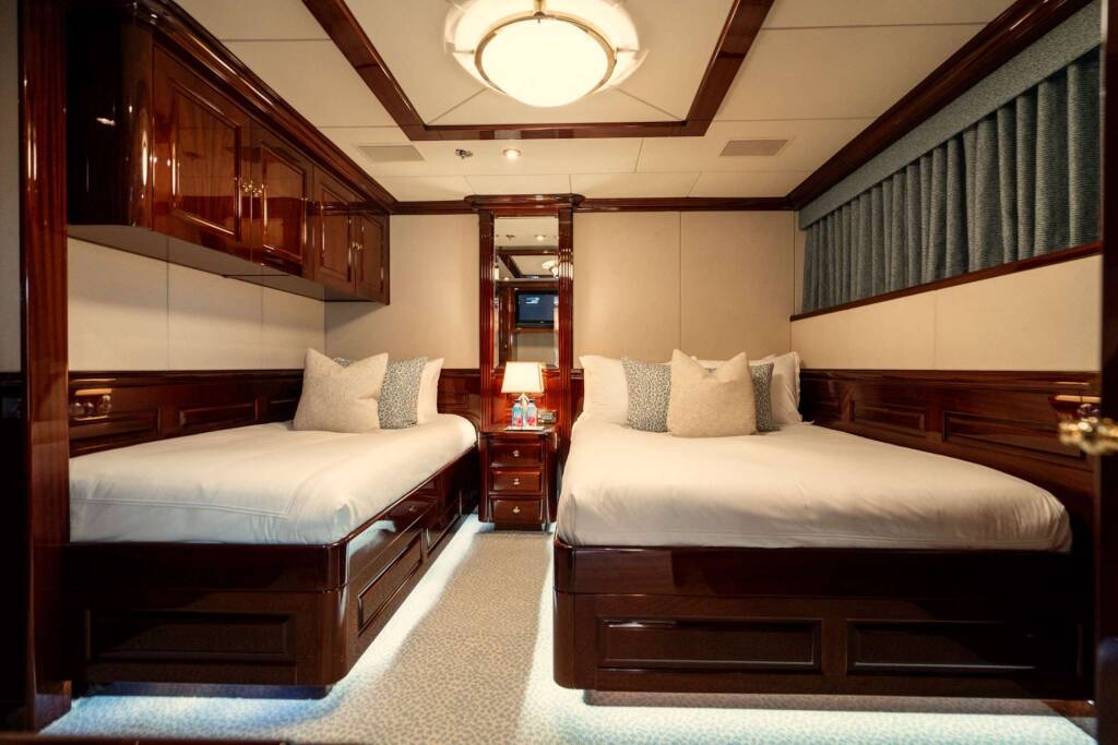 #5 - TWIN GUEST STATEROOM: This stateroom features a double bed, and a single bed, vanity/desk, and 36” flat screen TV. En-suite bath features a shower, sink & toilet. iPod docking station.