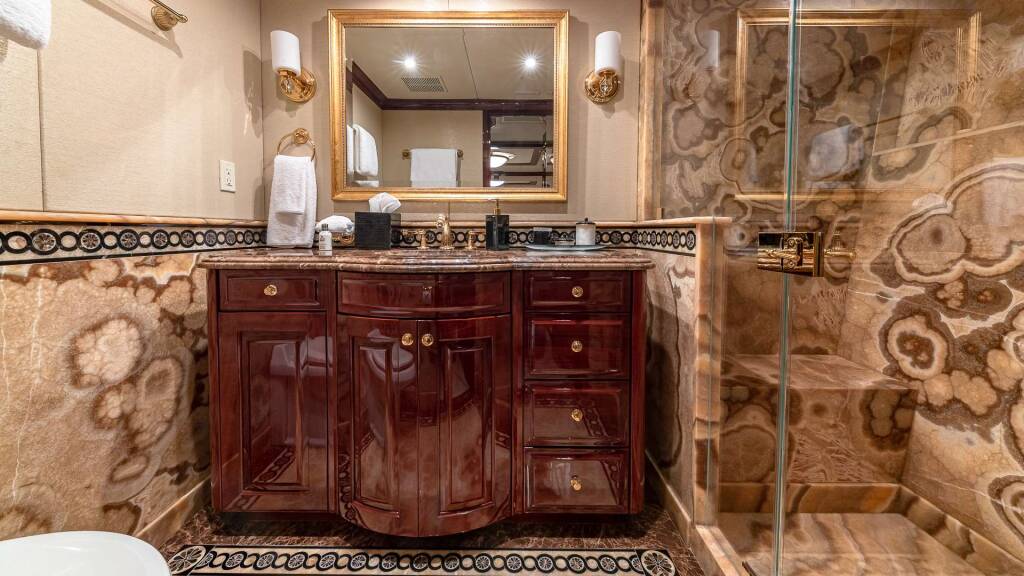 - Features a 60” flat screen TV (hidden behind artwork), surround sound, vanity to port and couch to starboard.