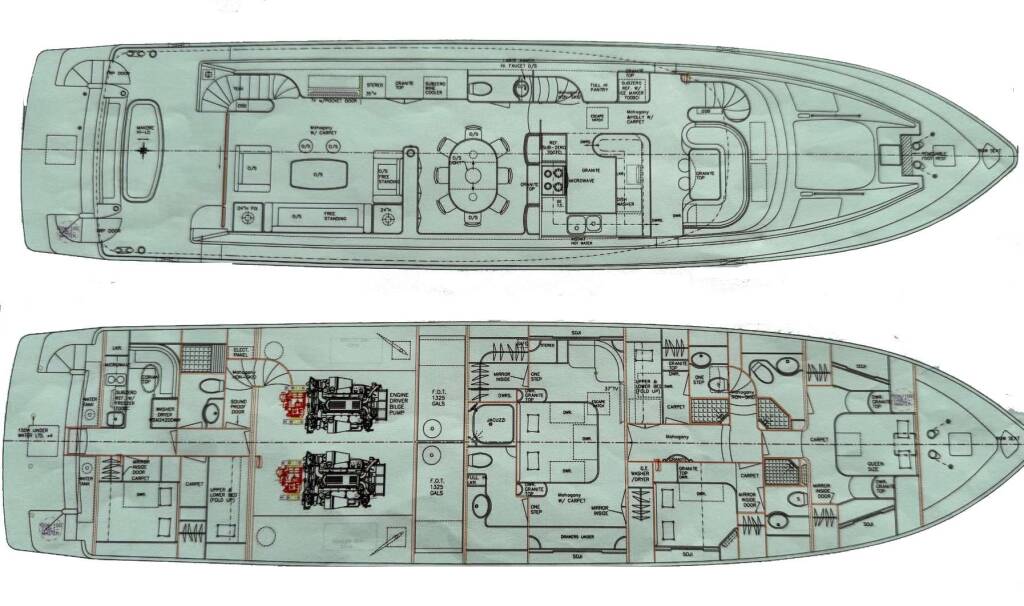 Accommodation: LEXINGTON features four staterooms each with en-suites, including his and hers baths in the master, which offers a king bed, while the VIP + starboard guest cabins have queen berths, and the port guest cabin has bunk-style twins. The main salon is outfitted with a large, brand-new sofa, pop-up TV and bar. Forward of the salon is the formal dining area that can seat up to eight guests. Moving forward, you'll find a wrap-around galley that includes a country-style dinette. The bridge + sky lounge is extended and features a day-head, bar and flat-screen TV, as well as a spacious seating area and grill on her aft deck.