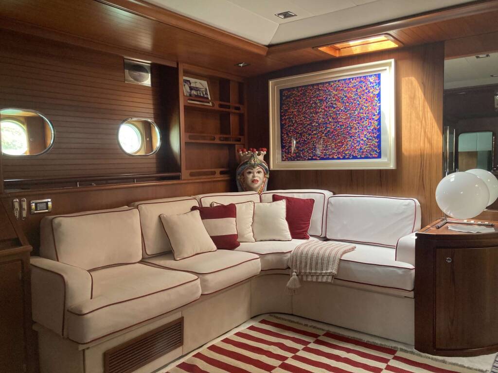 From the cockpit, it is possible to access the lower deck areas and the main living area, past a dedicated space for the Captain to manage the navigation from his authoritative suede seat and all the necessary communication equipment. The interiors, designed by Michele Bonan, surround the large living area in a modern but classic style. The warm wood creates a soft and homely atmosphere, while the carpet, sky and the white seats give that touch of freshness and brightness, ideal for the lower deck of sailing yachts. The designer chairs, the marble-effect dining table, the coffee table and the paintings on the walls communicate a sense of majesty and care for the interior furnishings.