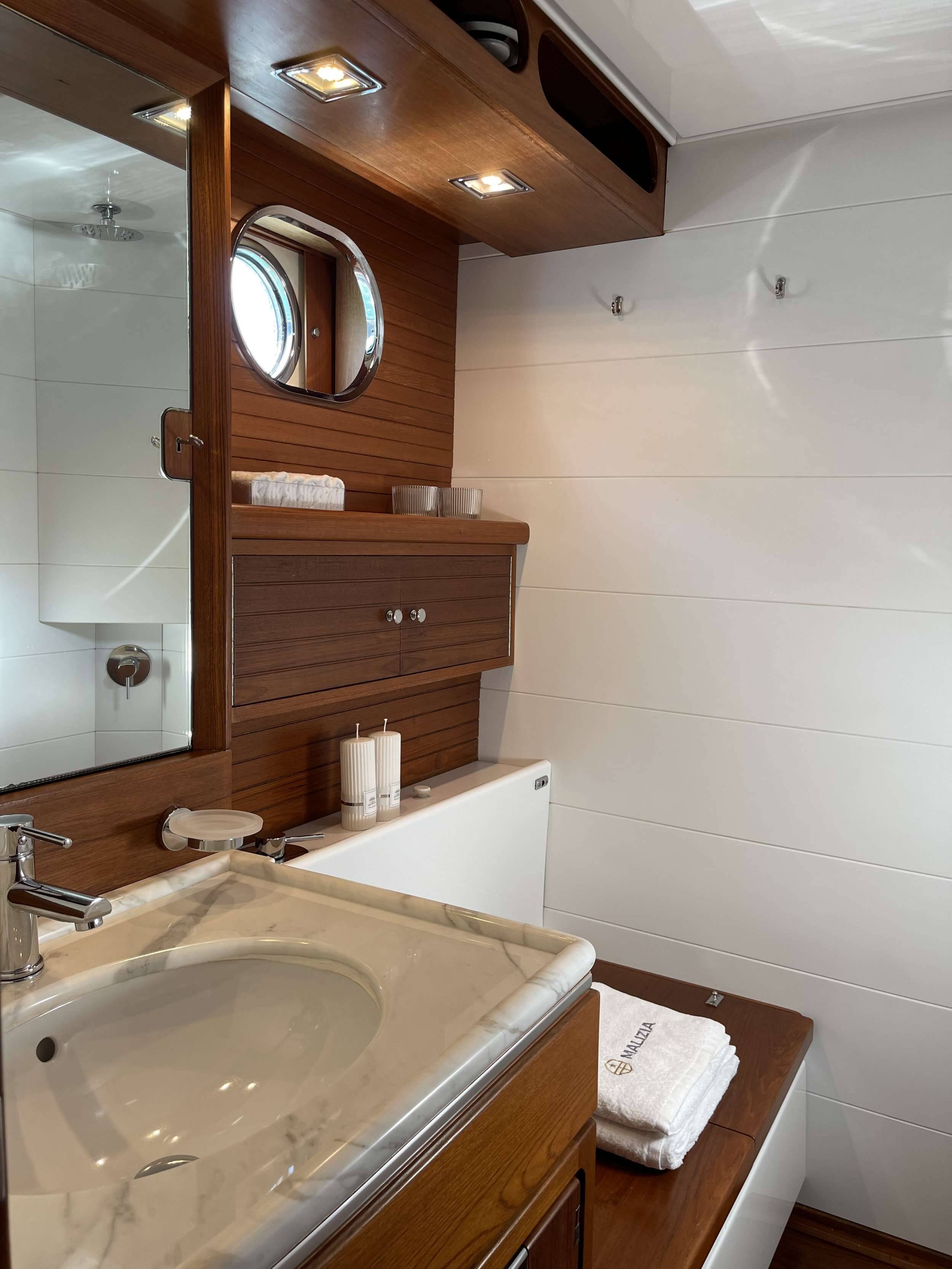 The three cabins of Malizia in the stern and bow of the yacht are all ensuite, and can accommodate up to seven guests. Aft we find the master cabin on the port side with its large king size bed, decorated with tasteful cushions, light upholstery and every detail thought out to perfection. A beautiful wooden bathroom with marble sink, toilet and shower is accessible from inside the cabin. Symmetrically on the right side of the yacht, we find the VIP cabin, with a queen size bed and a bathroom matching the master cabin.