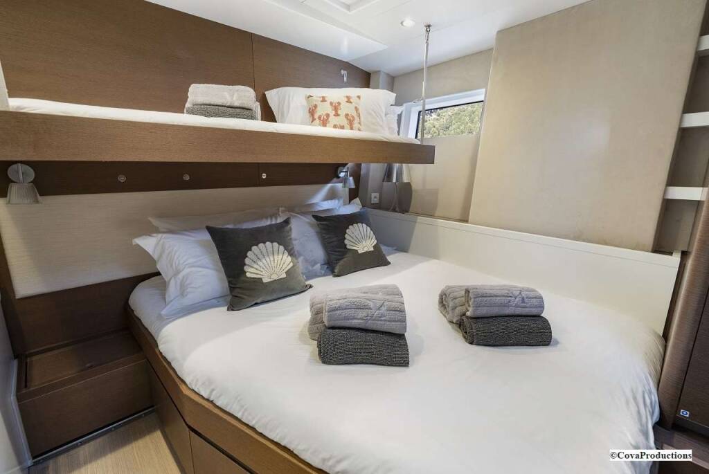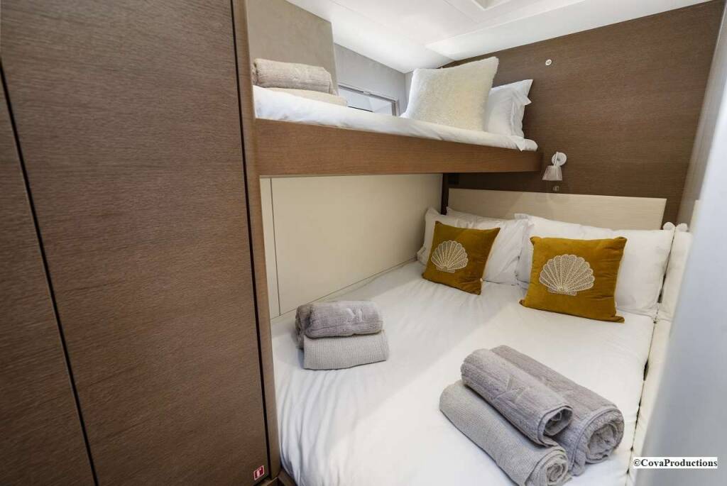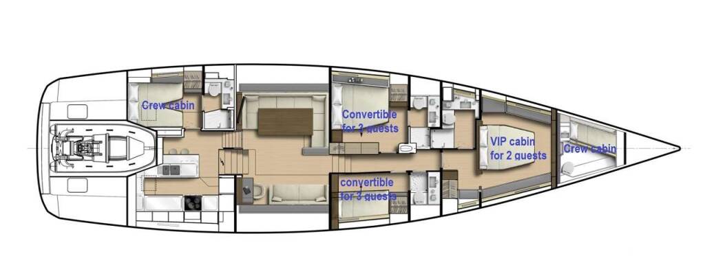 1 VIP cabin for 3 guests with one queen size bed convertible into 2 twin beds and one pullman